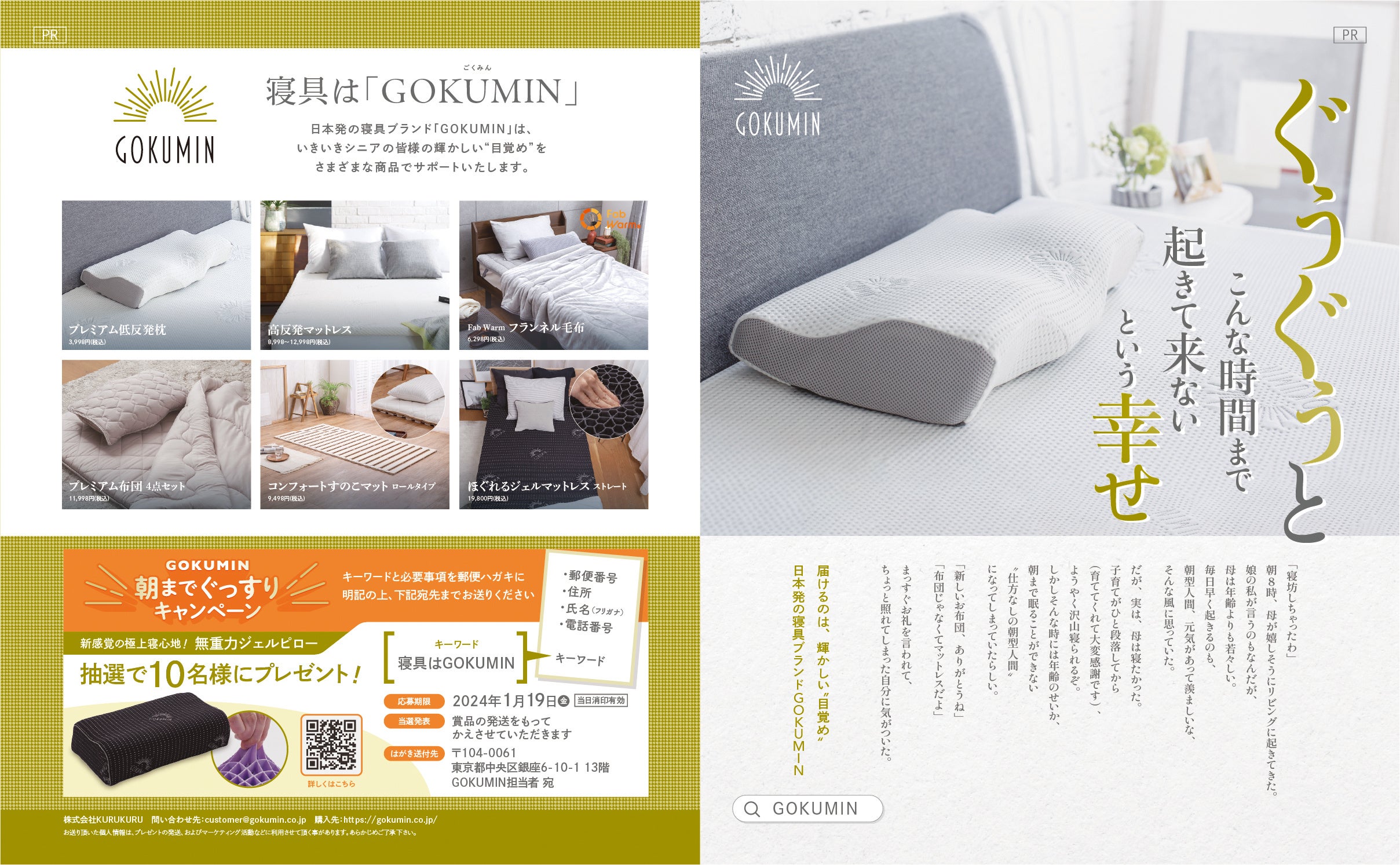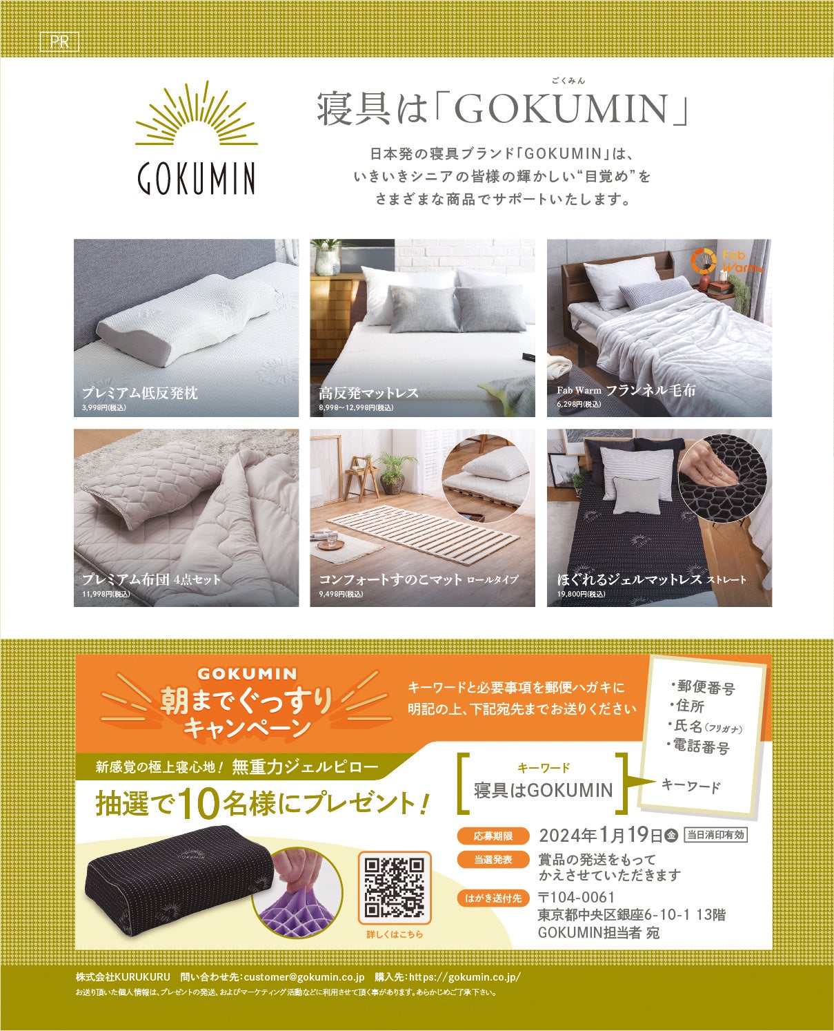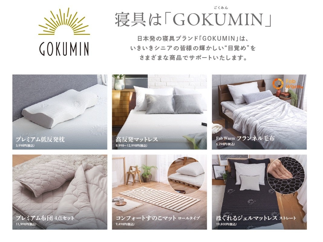 日本発の寝具ブランド「GOKUMIN(ごくみん)」は、いきいきシニアの皆様の輝かしい“目覚め”をさまざまな商品でサポートいたします。