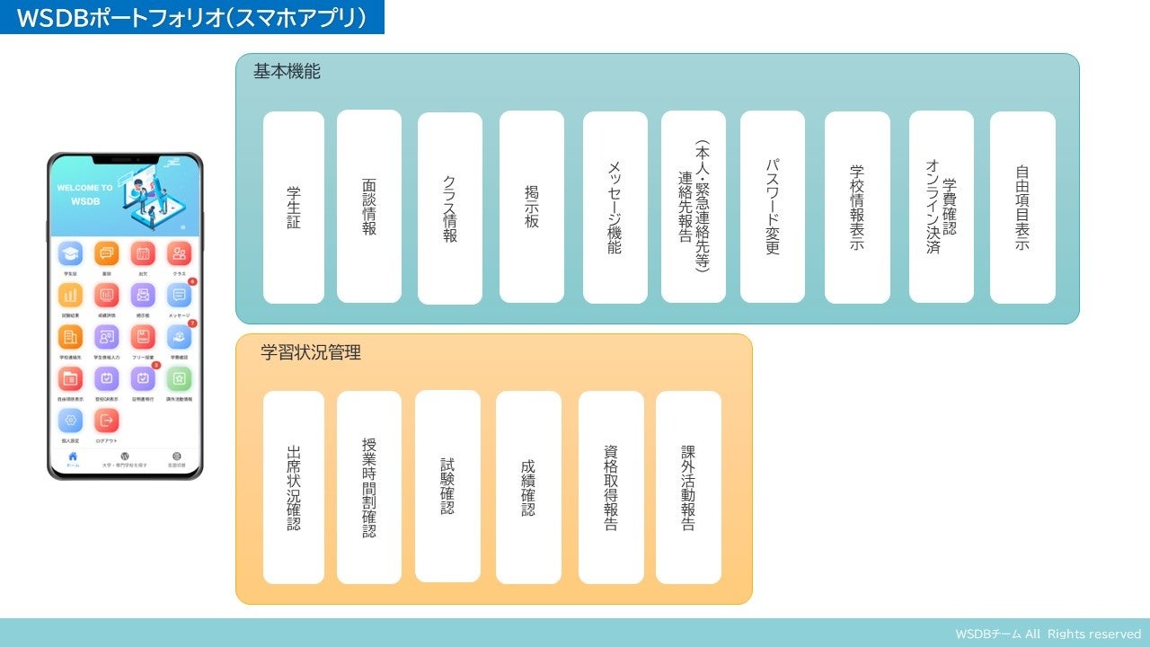 WSDBは、学生用スマホアプリを標準搭載(無償)することで、教職員が利用するクラウド化された学生情報と、学生のポートフォリオが一体化して提供されています。