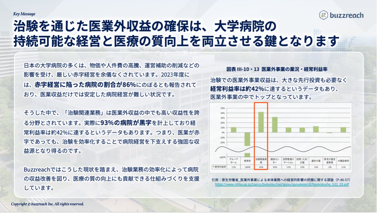 日本の治験実施環境の中核を担う大学病院の多くは、物価や人件費の高騰、運営補助の削減などの影響を受け、厳しい赤字経営を余儀なくされています。2023年度には、赤字経営に陥った病院の割合が86%にのぼるとも報告されており、医業収益だけでは安定した病院経営が難しい状況です。この状況を打破する一役として、今回の提携を通じて治験業務の効率化や症例集積性向上支援などに繋がる治験インフラを整備することで、多くの治験を実施する大学病院の発展、治験の加速と医療イノベーションの実装に貢献してまいります。