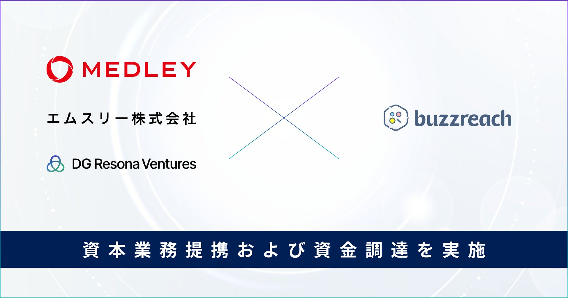 治験業務DX SaaS「Study Works®︎」や患者リクルート支援を中心に、治験・臨床研究領域特化のプラットフォーム展開で新薬開発の課題解決を目指す株式会社Buzzreach(本社:東京都港区、代表取締役CEO:猪川 崇輝、以下Buzzreach)は、株式会社メドレー(本社:東京都港区、代表取締役社長:瀧口 浩平、以下メドレー)、およびエムスリー株式会社(本社:東京都港区、代表取締役:谷村 格、以下エムスリー)と資本業務提携契約を締結したほか、DGりそなベンチャーズ1号投資事業有限責任組合(所在地:東京都渋谷区、以下DGりそな)から資金調達を実施いたしました。本提携および調達を通じ、各社の医療・ヘルスケア・金融アセットを活用し、症例集積率・治験実施率の向上と日本版DCT(分散型臨床試験)エコシステムの社会実装を強化します。