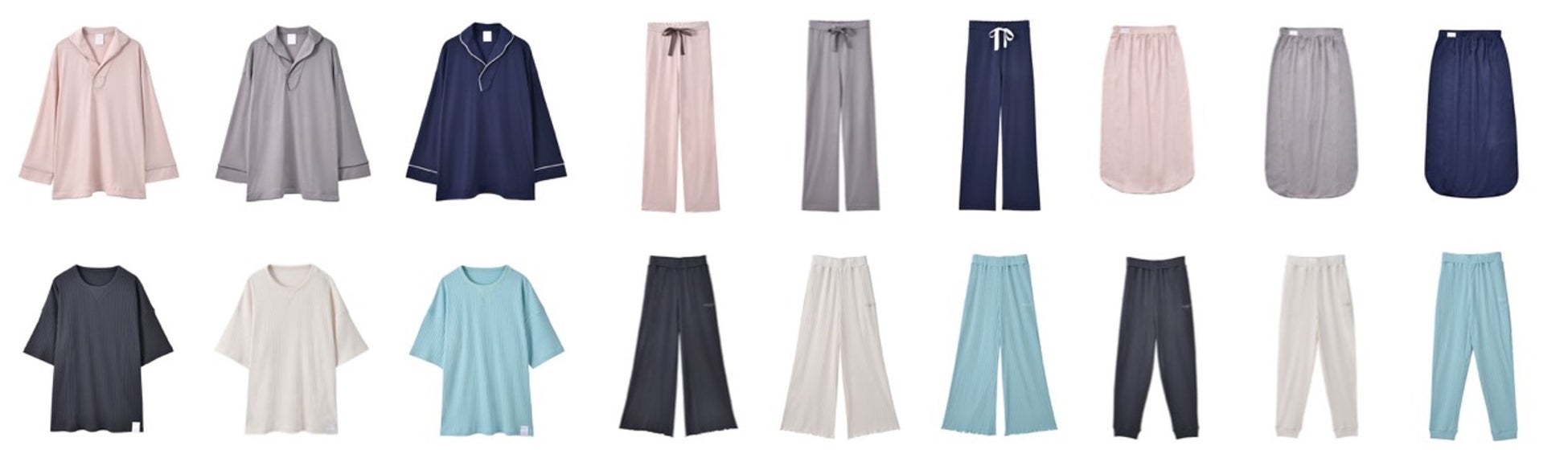 左上から右へ順に①シルキーパジャマトップス 13,800円 / ②シルキーパジャマボトム 11,800円 / ③シルキーナイトキャップ 5,500円 / ④リラックスオーバーサイズリブトップス 12,800円 / ⑤リラックスメローフリルリブパンツ 11,800円 / ⑥リラックスリブジョガーパンツ 11,800円