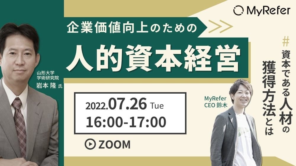 株式会社MyRefer(本社:東京都新宿区、代表取締役社長CEO:鈴木貴史)は、山形大学 学術研究院 産学連携教授・岩本 隆氏を講師に迎えて、「企業価値向上につながる人的資本経営」をテーマにしたオンラインセミナーを2022年7月26日(火)に開催いたします。(申込み:https://bit.ly/3RzCw3U)