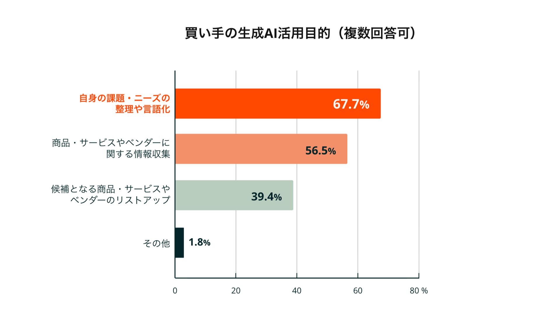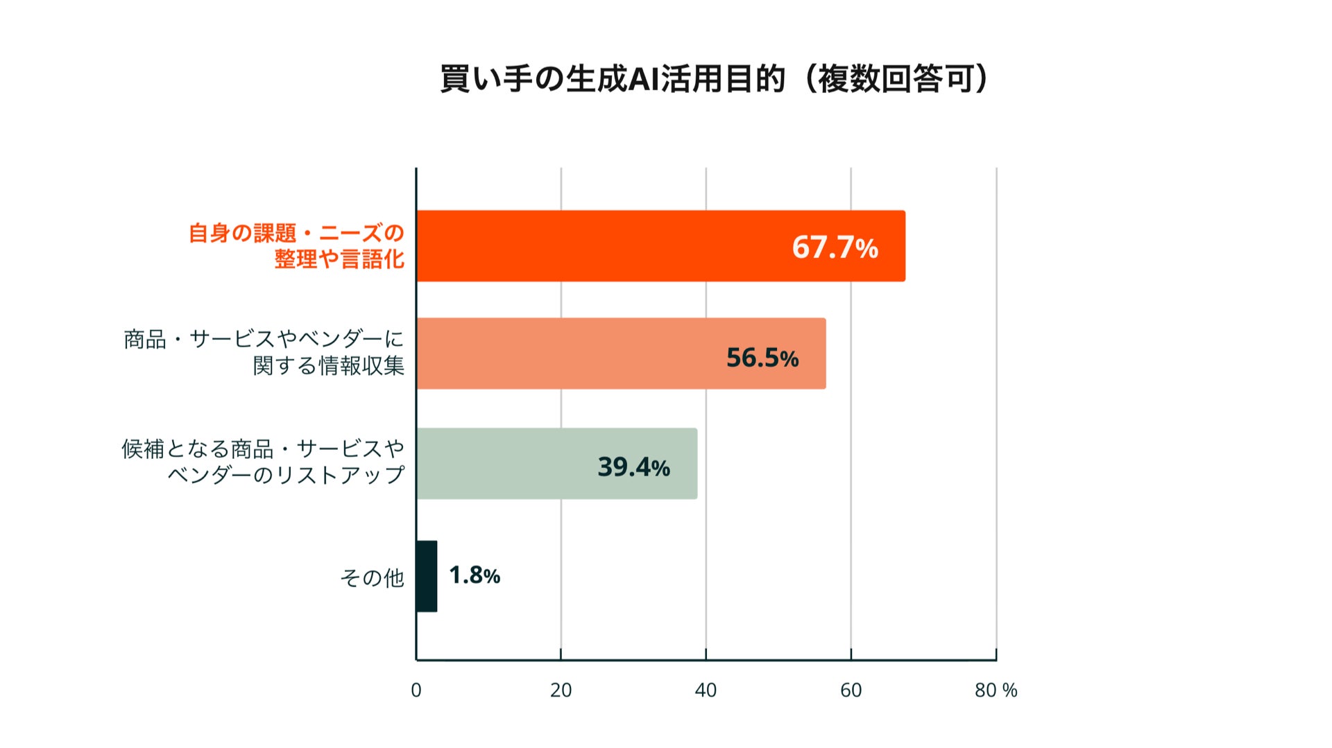購買検討時に生成AIを活用したことがある買い手は合計36.7%で、そのうち直近1年以内に活用した人が33%を占め、購買プロセスにおける生成AIの利用がこの1年間で急速に広がったことがわかりました。活用目的は「自身の課題・ニーズの整理や言語化」が最多で、「商品・サービスやベンダーに関する情報収集」「候補となる商品・サービスやベンダーのリストアップ」が続いており、営業プロセスの序盤の重要フェーズに生成AIが深く関与し始めています。