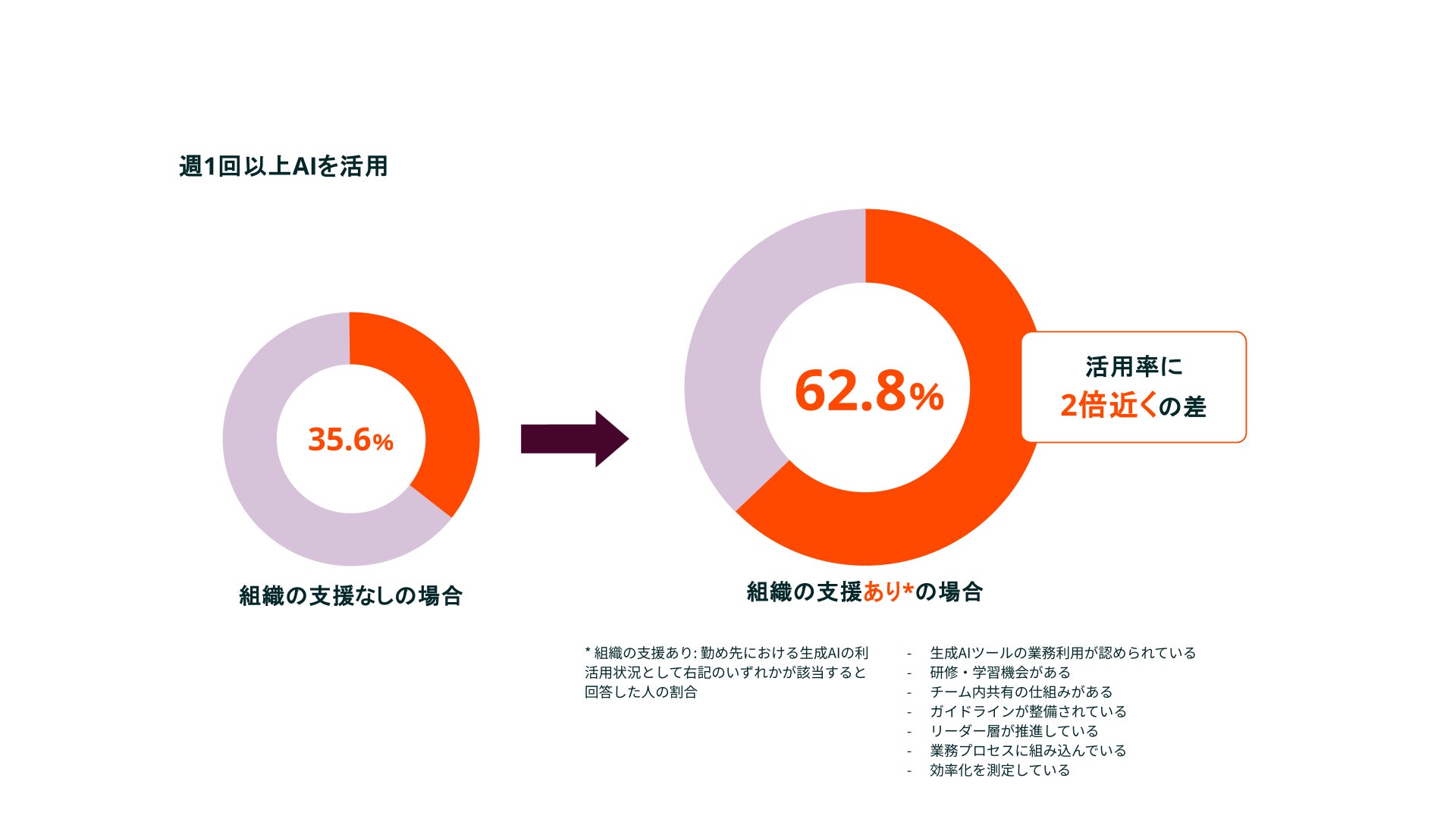 生成AIを週1回以上活用している人の割合を比較すると、組織支援が「ない」場合は35.6%にとどまる一方、「ある」場合は62.8%と、約2倍近い差が見られました。組織支援とは、業務利用の許可、研修や学習機会、チーム内での共有の仕組み、ガイドラインの整備、リーダー層による推進、業務プロセスへの組み込み、効率化の測定などのいずれかを指します。
