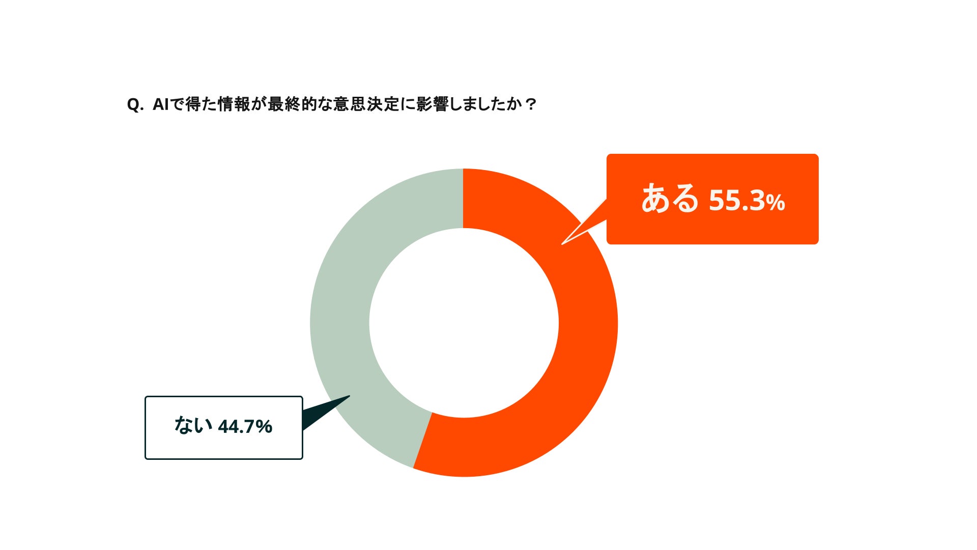 生成AIを活用した買い手のうち、「生成AIで得た情報がきっかけで、当初検討していなかった製品を候補に加えた」人は52.4%、「生成AIで得た情報が最終的な意思決定に影響した」人は55.3%に達しました。いずれも半数を超えており、商談開始から意思決定に至るまで、買い手への生成AIの影響力が高まっていることがわかります。