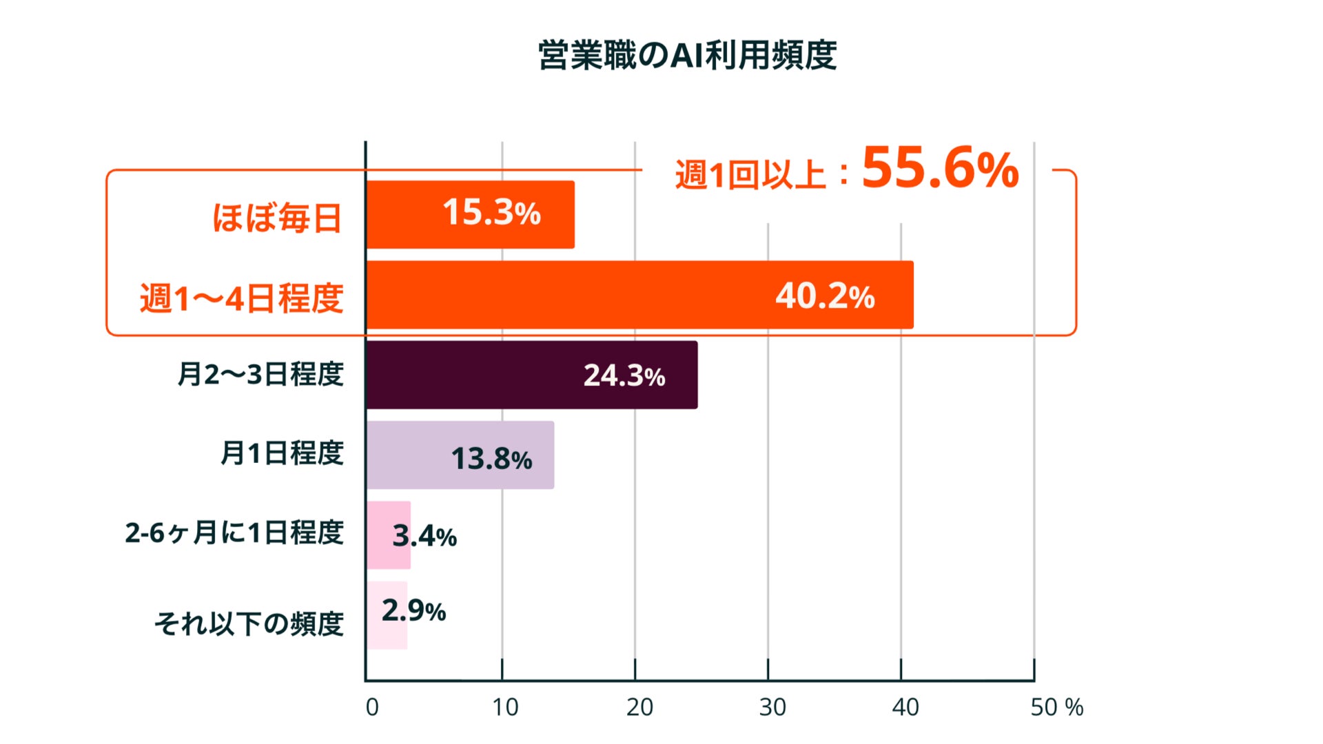 営業担当者および営業責任者の生成AI活用率は1年で28.9%から43.4%へと14.5ポイント増加しました。さらに、生成AI活用経験のある人の半数以上(55.6%)が「週1回以上」利用しており(ほぼ毎日15.3%、週1〜4日40.2%)、日常業務への定着が進んでいます。