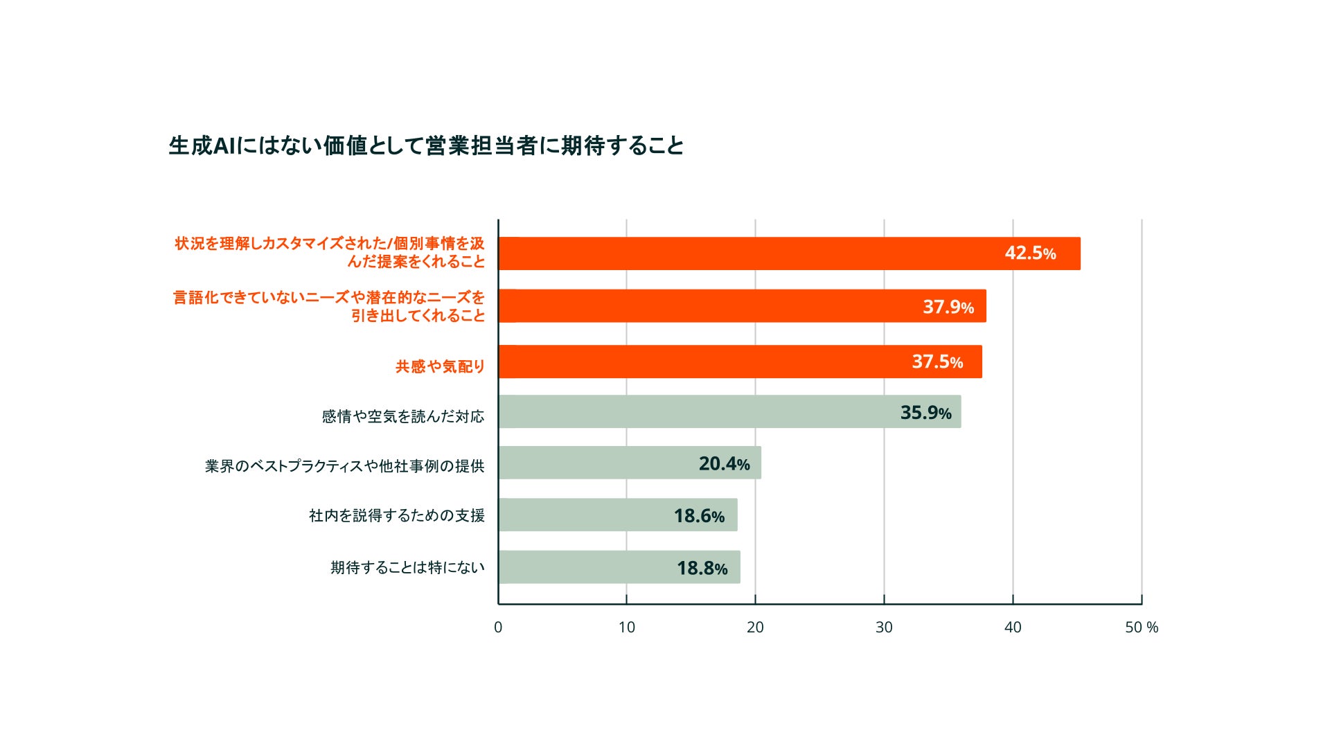 買い手が営業に求める生成AIにはない価値として「個別事情を汲んだ提案」「潜在ニーズの引き出し」「共感・気配り」が上位