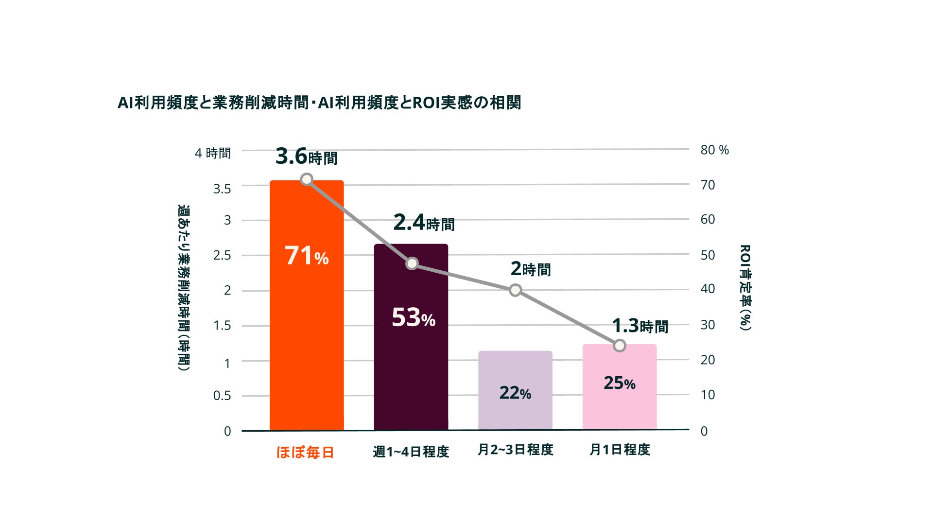 生成AIは使うほど成果を実感しやすく、毎日利用者では週平均3.6時間削減・ROI実感率71%