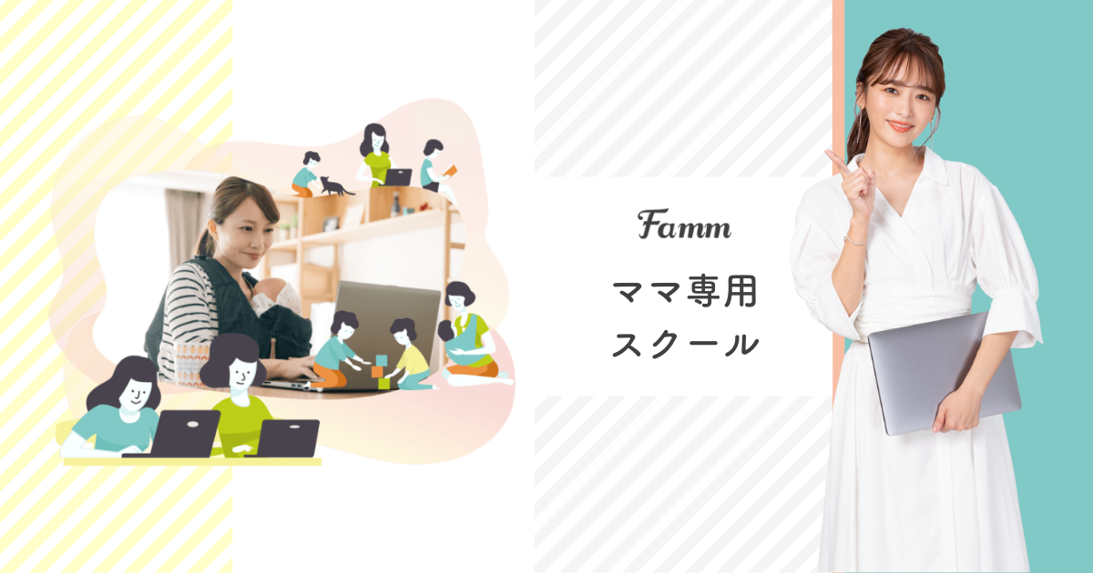 育休中のママに大人気のFammママ専用スクールとは、育児中の女性が子供と一緒に通えて、Webデザインやグラフィックデザイン、動画クリエイターなどのスキルを学べる1カ月の短期集中型オンラインスクールです