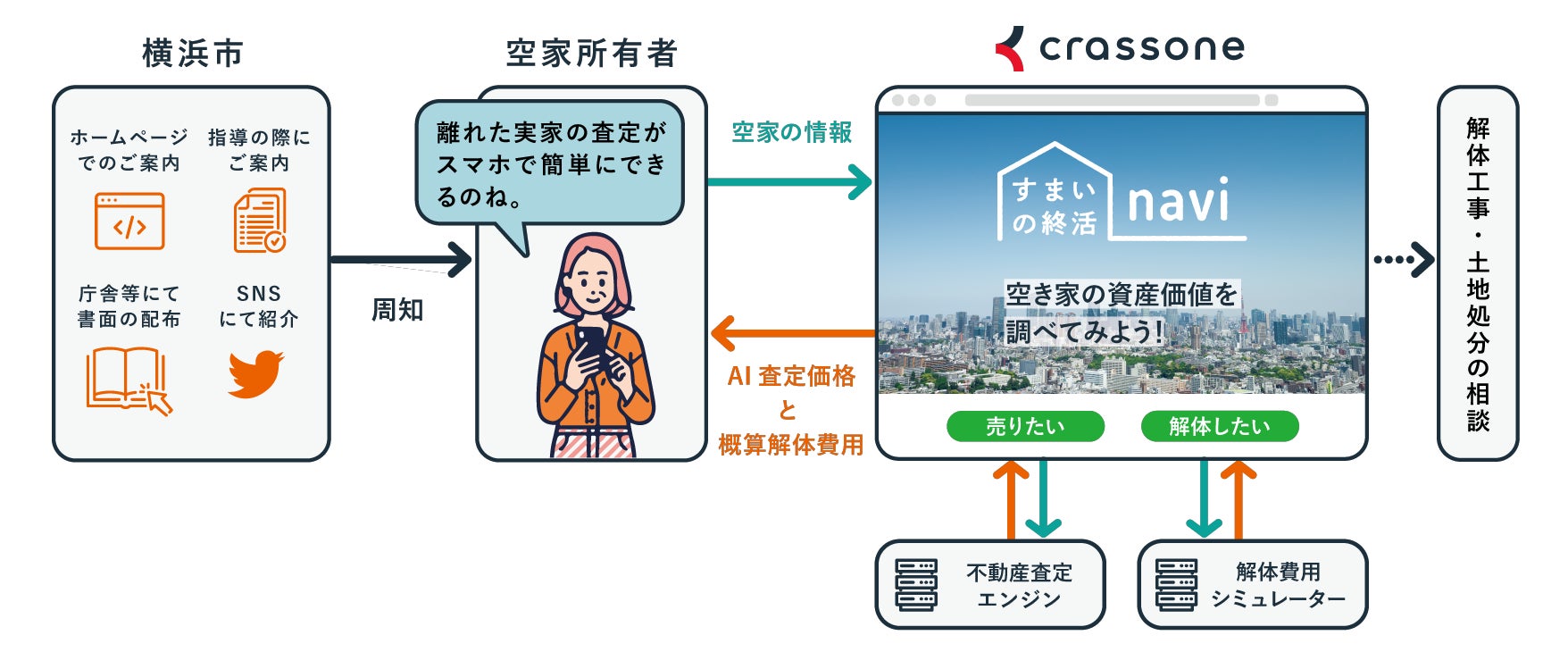 - 横浜市民や空き家所有者に対し、解体費用や土地売却査定価格を提示する「すまいの終活ナビ」を紹介(URL:https://crassone.jp/simulator/navi/kanagawa/yokohamashi)