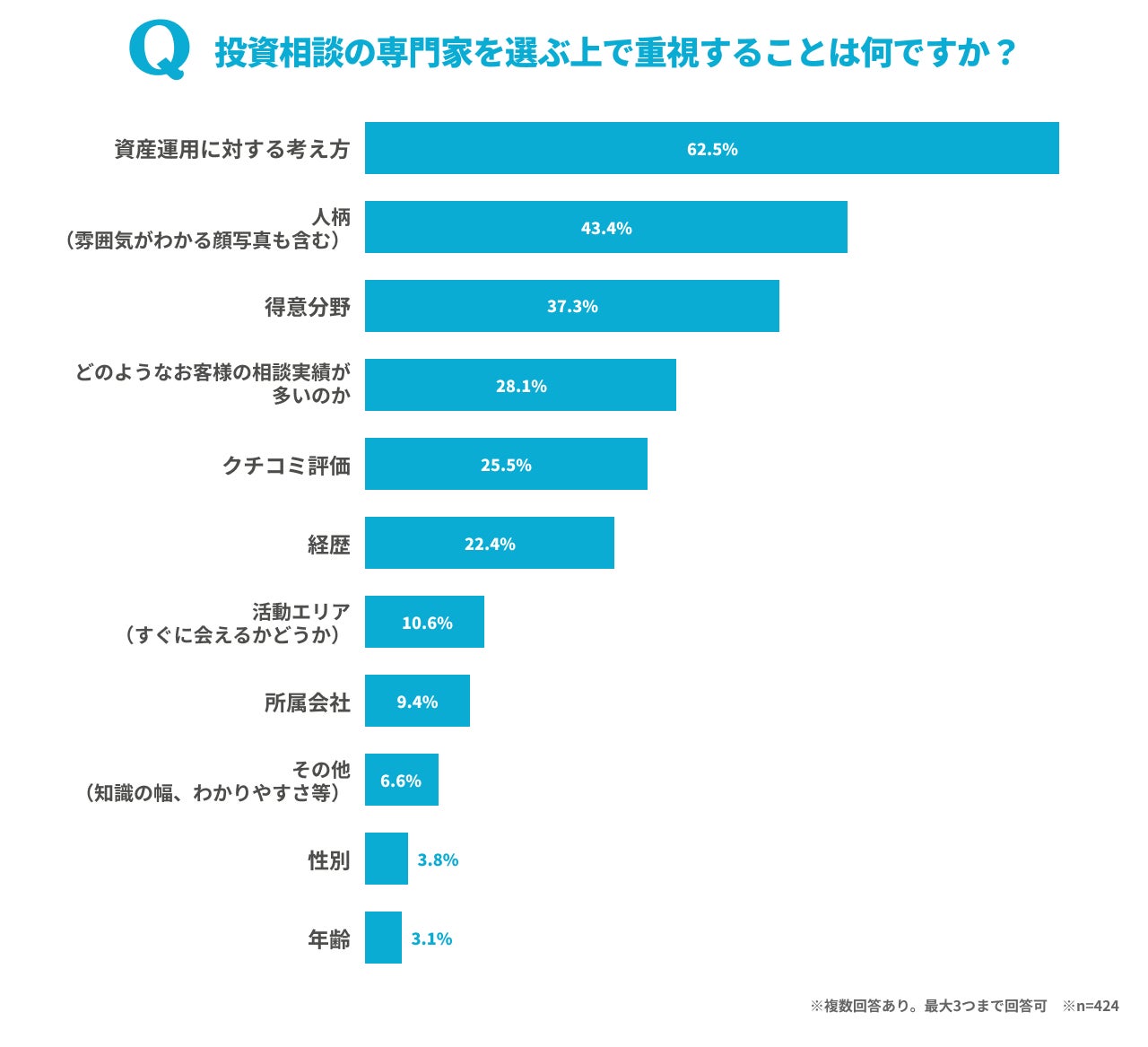 実際、過去当社がユーザー向けに「投資の相談をする専門家を選ぶ際に重視すること」を調査(※1)したところ、上位の回答は「資産運用に対する考え方」(約63%)、「人柄」(約43%)、「得意分野」(約37%)。プランナーの年齢や性別、所属会社、活動エリアよりも、プランナー個人の考え方や人柄を重要視する人が多いことが伺えました。