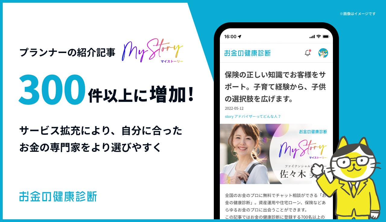 岸田政権が策定する資産所得倍増プランの一案として、NISA制度の年間投資枠の拡大や恒久化などが話題となっています。制度の見直しが検討される一方で、個人が投資を始めるハードルは依然高いと言われています。そんななか、お金のオンライン相談サービス『お金の健康診断』を運営する株式会社400F(フォーハンドレッド・エフ、本社:東京都中央区、代表取締役社長:中村 仁、以下「400F」)は、より多くの人が自分に合うお金の専門家を見つけ、気軽に相談できるようサービス機能を拡充。登録プランナーの自己紹介記事『My story』が300件以上に増加しました。