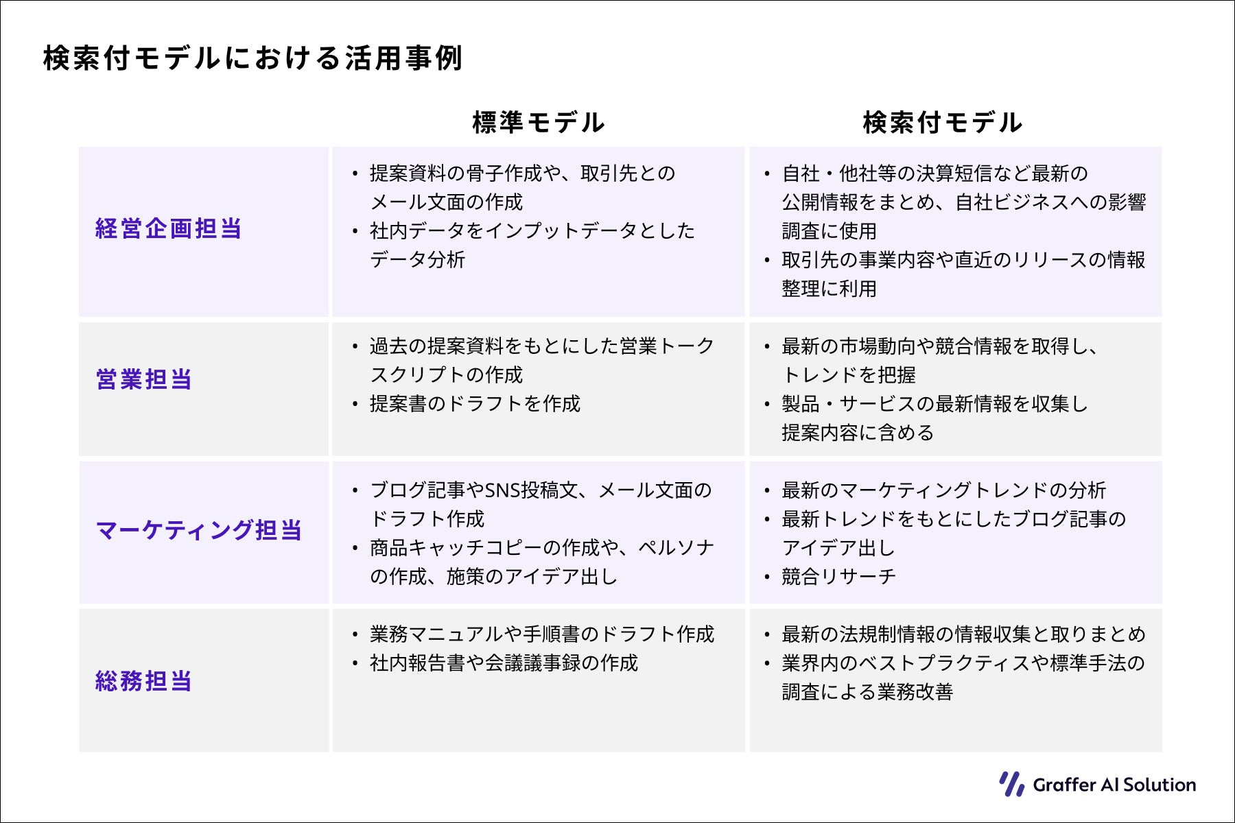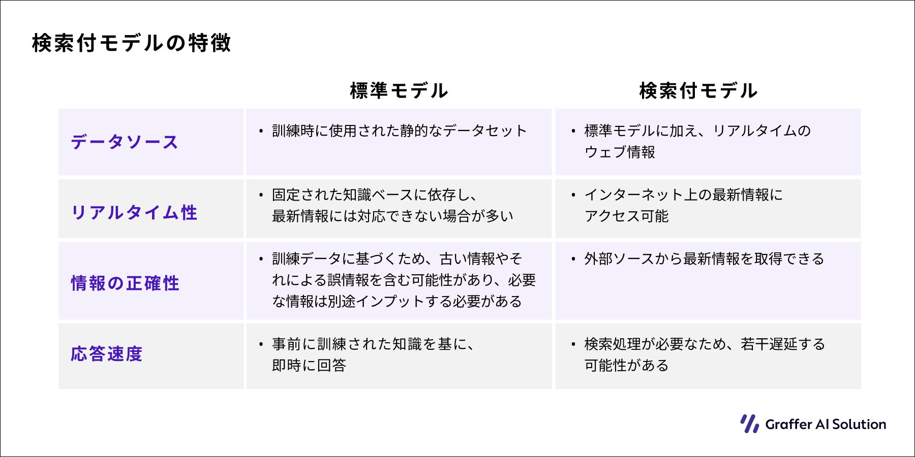 検索付モデルでは、最新情報やリアルタイムデータを必要とする場面で有効に機能し、迅速な意思決定を支援します。