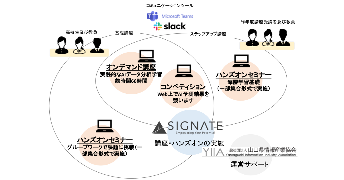 AI開発・運用、DX人材育成サービスを提供する株式会社SIGNATE(本社:東京都千代田区、代表取締役社長:齊藤 秀、以下 SIGNATE)は、山口県(山口県教育委員会)からの委託を受け、一般社団法人山口県情報産業協会と連携して『やまぐち高校生データサイエンティスト育成講座』の企画からオンデマンド講座及びハンズオンセミナーの提供までを担うことになりましたので、お知らせいたします。