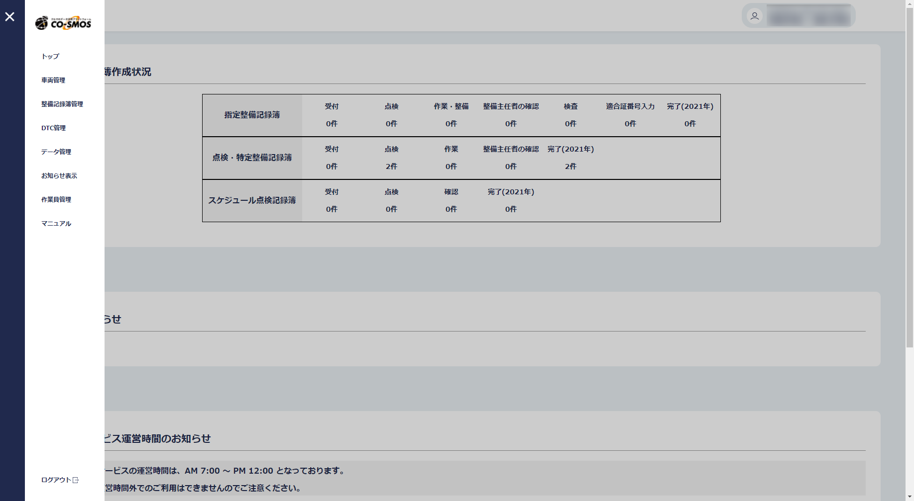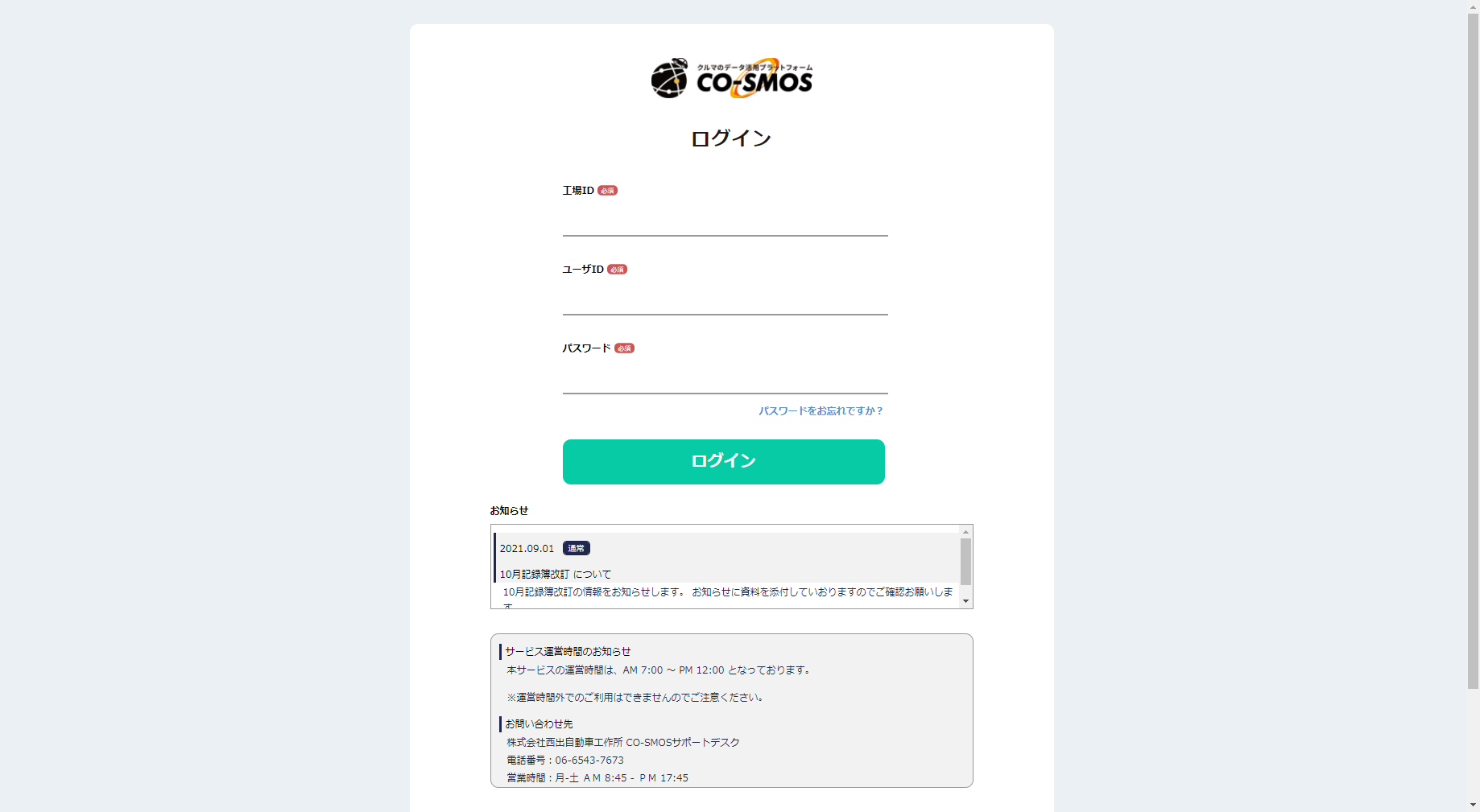 | お問合せ先 | 株式会社西出自動車工作所 CO-SMOSサポートデスク 電話番号:06-6543-7673 営業時間:月-金 AM 8:45 - PM 17:45 |