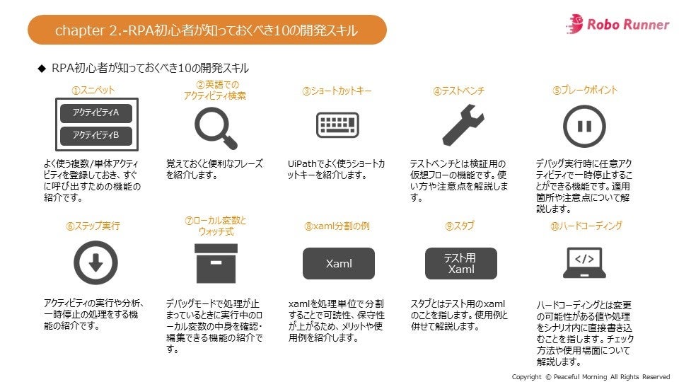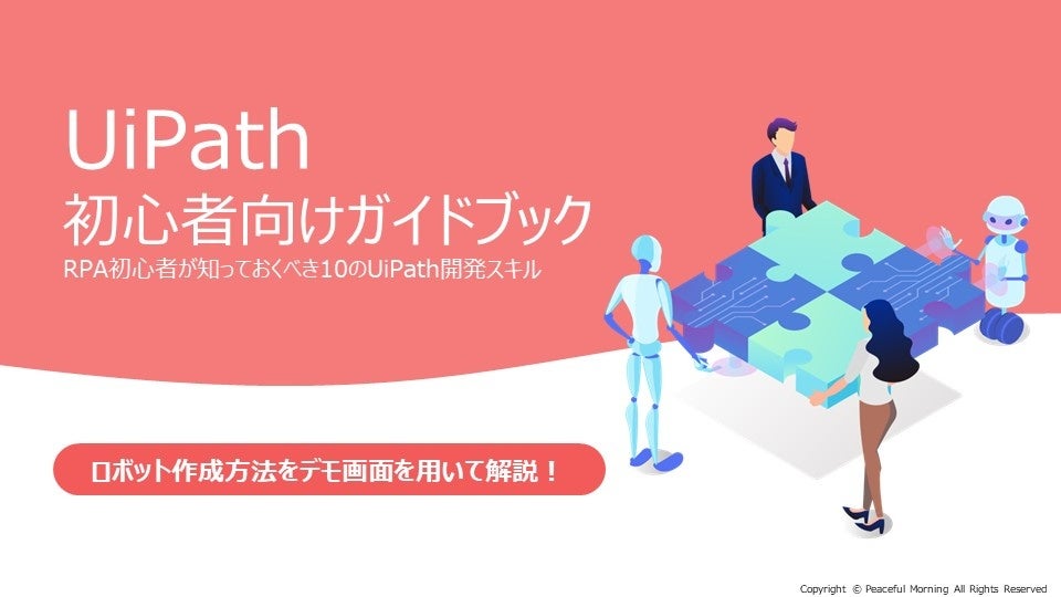 約1,000名のRPAエンジニア・コンサルタントが登録する「RPAプロフェッショナル」、RPA導入後の伴走型支援サービス「Robo Runner(ロボランナー)」等、RPA領域で包括的にサービスを展開するPeaceful Morning株式会社(本社:東京都渋谷区、代表取締役:田中 雄太 以下「当社」)は、UiPathの初心者向けガイドブックを公開します。