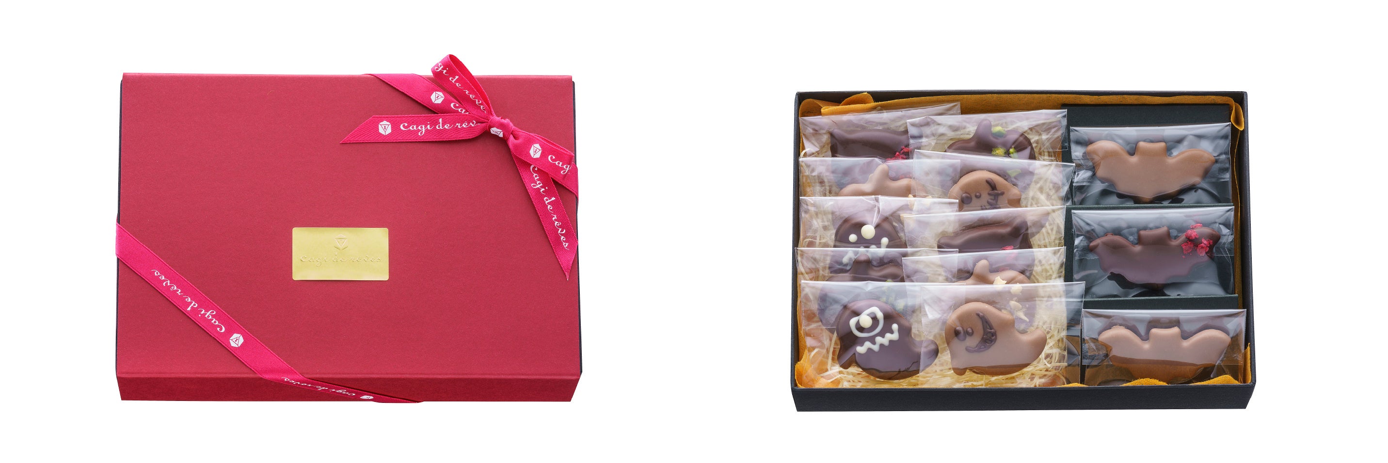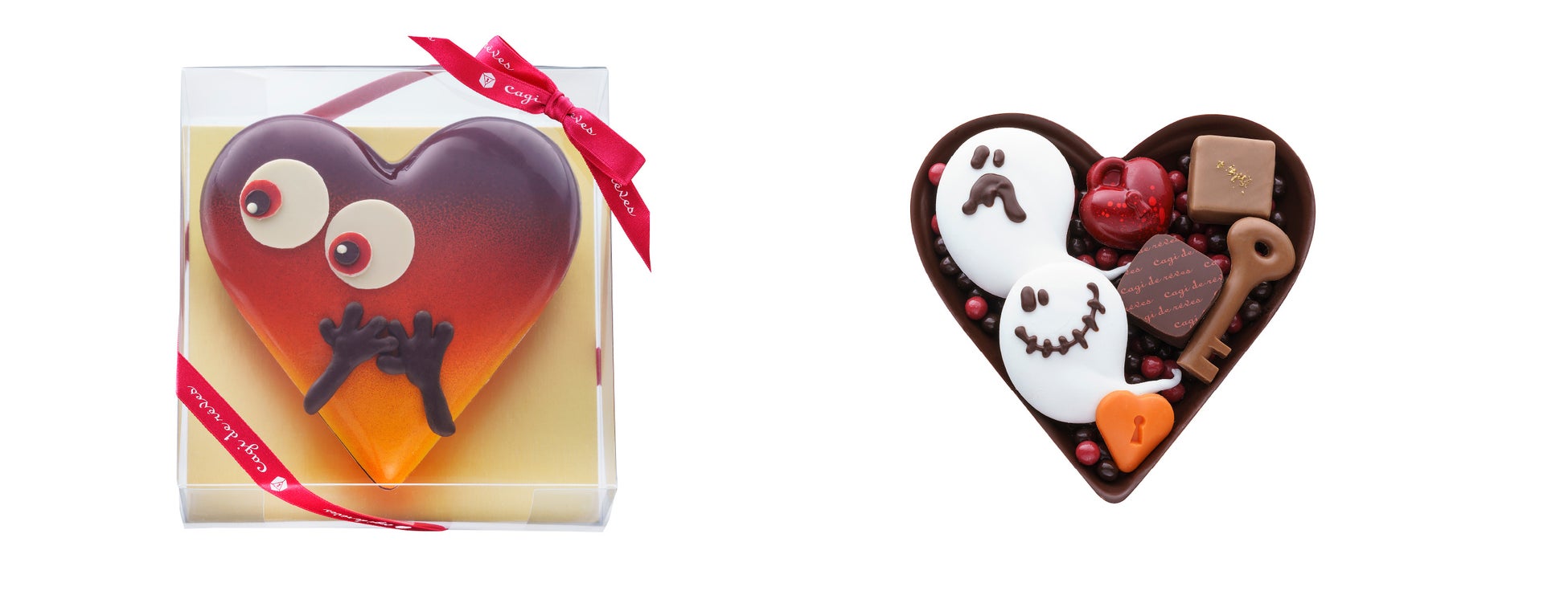 表情豊かな可愛らしいライム味のおばけギモーブ。カカオ33%の「鍵型ショコラ」、鍵穴が可愛い「ハート型ショコラ」、力強いカカオの風味を感じられるキャギ ド レーブのロゴ入りの「ナチュール」、