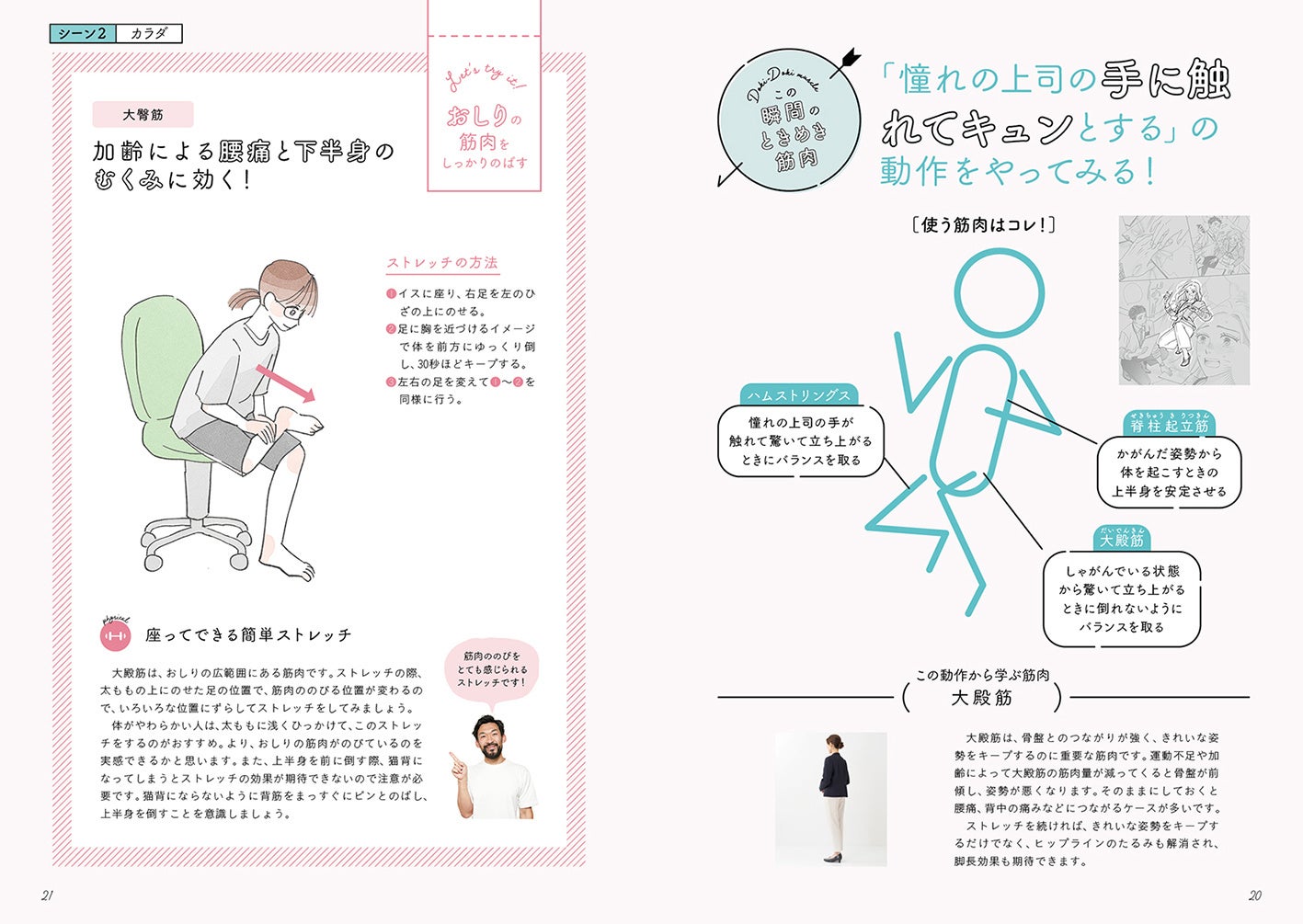 本編は22のシーンで構成されており、各シーンが「ココロのページ」と「カラダのページ」に分かれています。「ココロのページ」は、ライトノベルと漫画で胸キュンシーンを描きます。描写の細かい文章と漫画家・アキヤマ香氏による漫画で、主人公の胸キュンを鮮明に想像できる構成となっています。「カラダのページ」は、前田監修のもと、各シーンではたらく筋肉と、おすすめのストレッチを紹介します。椅子に座ってできるものなど、どこでも実践できる種目が中心で、これから運動を始めたいという方におすすめです。