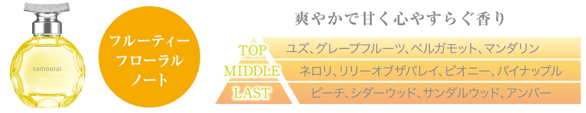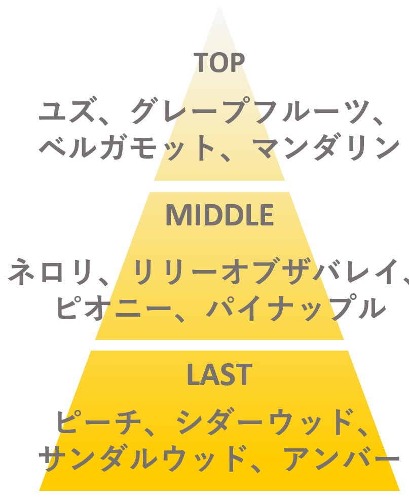 トップノートは、ほんのりと上品な深みを感じるユズとみずみずしく弾ける柑橘のブレンドが合わさり、晴れ晴れとした気分に導かれます。ミドルノートでは柑橘の爽やかさを含んだネロリ、しとやかな花々、パイナップルの甘さが優しい女性らしさを演出します。ラストノートには穏やかな甘さのアンバーにシダーウッドやサンダルウッドがほのかなスパイスや深みを与えて、サムライウーマンらしい香りのストーリーとなっています。