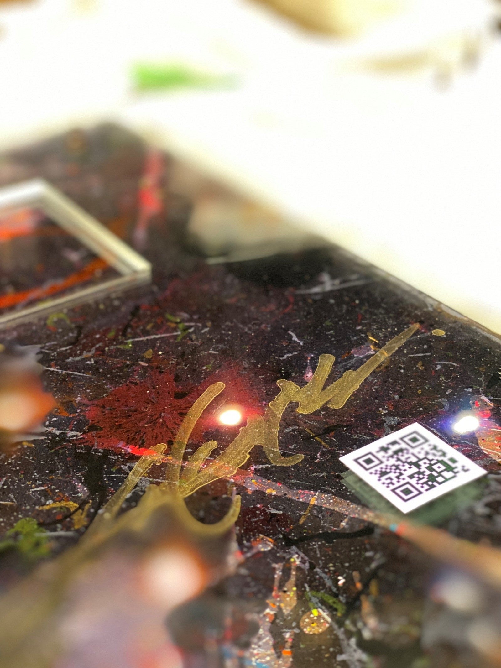 現代アート作家、松嶺貴幸氏の作品にHyperJコードを貼り付け、本物であることをブロックチェーンで証明すると同時に、PR動画によって作品の価値をアピールする取り組みが始まりました。HyperJコードをスマホで読み取ると、作品のPR動画やブロックチェーン証明書が表示されます。国際的に作品展示・発表を行っている松嶺氏の作品は、模倣品や偽物が出回る可能性があり、国際的な取引市場では摘発することが困難です。本物であることを証明することで、購入者に安心感を与え、ブランド力を高めるという効果があります。