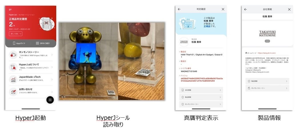 松嶺貴幸氏の作品に付与されたHyperJシールをスマートフォンから読み取ることにより、作品が正規品であるか、偽造品であるかを判別することが可能です。作品情報はブロックチェーン上に登録されており、第三者による情報の改ざんが非常に困難となっているため、作品の購入者に安心感を与えるとともに、ブランド力を高めることが可能です。