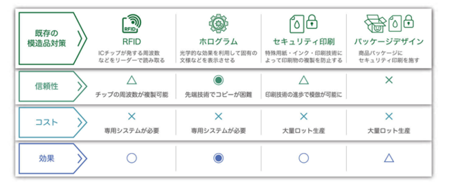 従来のトレーサビリティでは、HyperJシール自体の偽造や、アクセスした先のサイトが不正サイトなどのリスクがありました。また、ブロックチェーンを使った真贋システムは高コストで実用化が困難でしたが、リーガルテック社の新技術は低コストでブロックチェーンを活用した自社専用の真贋判定システム構築が可能になりました。
