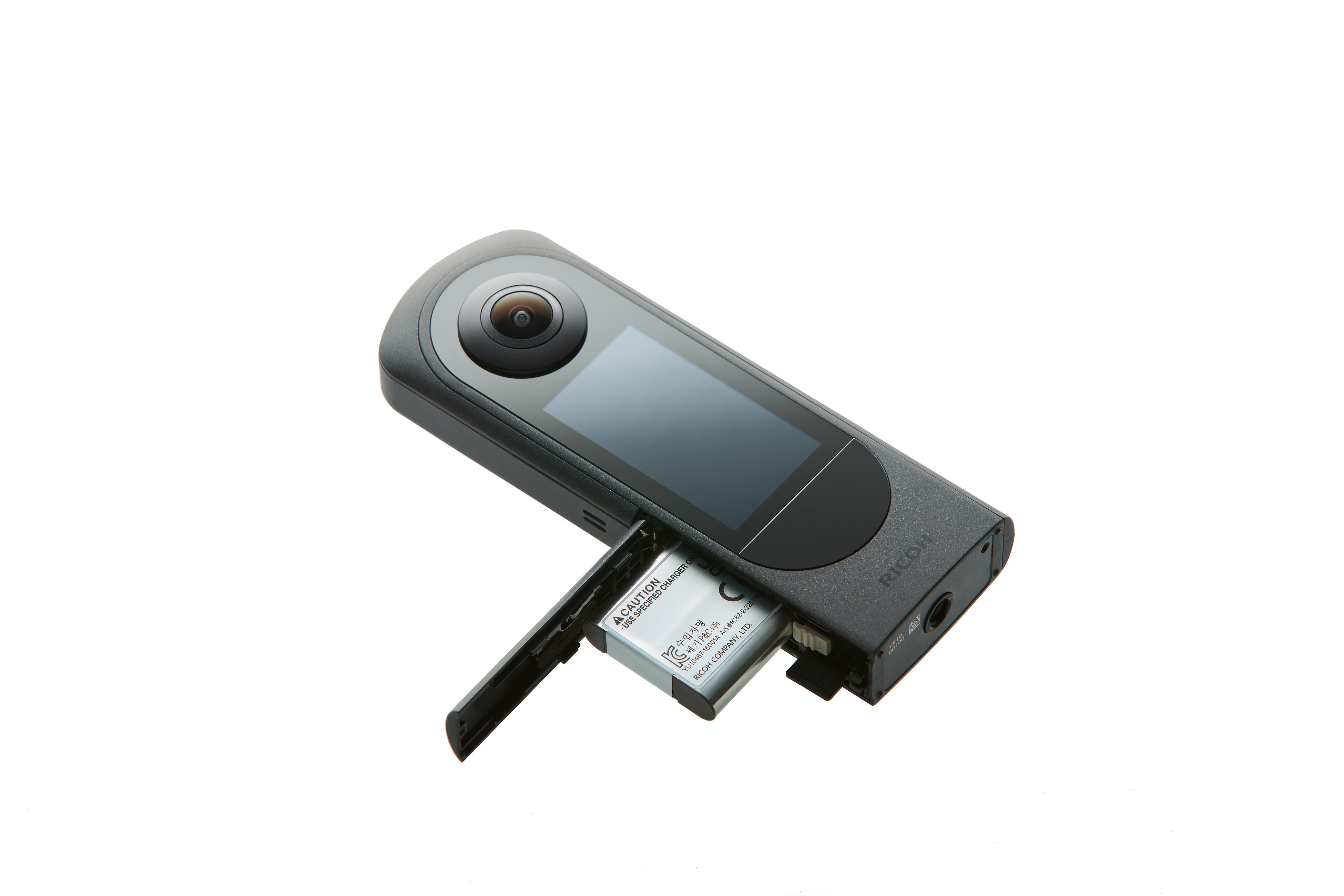 - RICOH THETAシリーズで初のバッテリー・メモリーカード(microSDXC)の交換に対応したため、長時間にわたるビジネスシーンでも安心して確実な撮影が行えます。また予備バッテリーとして、別売りの「充電式バッテリー DB-110」も使用できます。