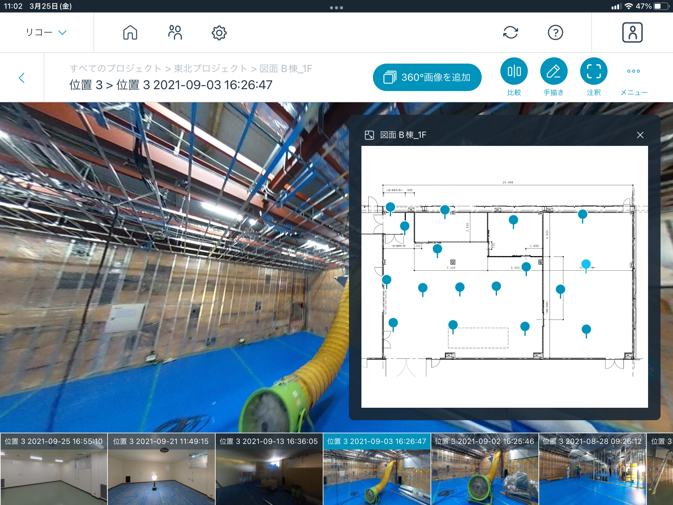 - 建設業向けに、RICOH360 Projects*5と連携し、現場の状況を遠隔地からリアルタイムに把握できるタイムラプス/ライブ映像機能(β版)や、現場の巡視時の撮影画像を自動で図面上に整理する建設業向けオートマッピング(β版:2022.6)を提供します。