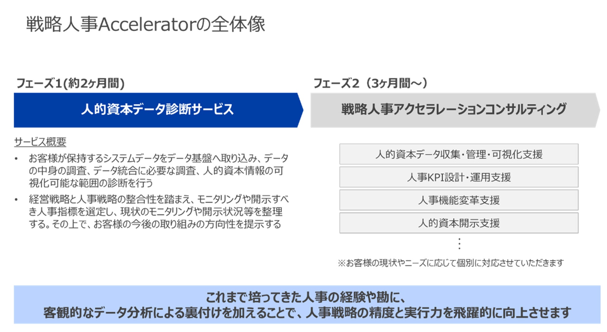 「戦略人事Accelerator」は、企業の人事部門がデータドリブンHRおよびピープルアナリティクスを本格的に推進し、戦略人事へ迅速かつ効果的に移行するためのコンサルティングサービスです。