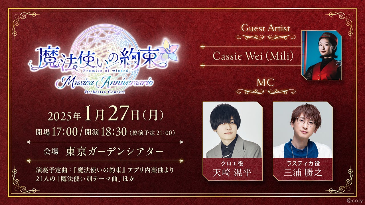株式会社coly(東京都港区、代表取締役社長:中島杏奈)は、2025年1月27日(月)東京ガーデンシアターにて、『魔法使いの約束』オーケストラコンサート−Musica Anniversario− を開催いたします。