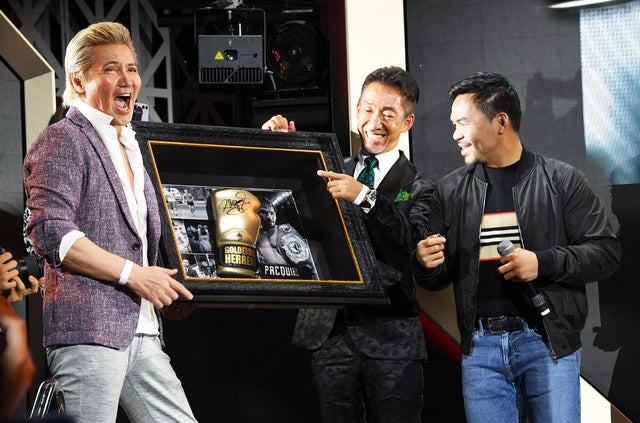 ボクシング世界8階級制覇王者で昨年引退したマニー・パッキャオ(43=フィリピン)が、5月22日(日)に栃木県内で開催された『マニー・パッキャオ チャリティマラソン』に参加した後、都内にて行われた『ONE ASIA 未来チャリティプロジェクト発表記念イベント』へも出席。自らの豪華なショーケースに入った”金色”のサイン入りグローブをオークションに出品。それを俳優の竹内力が120万円で落札しました。