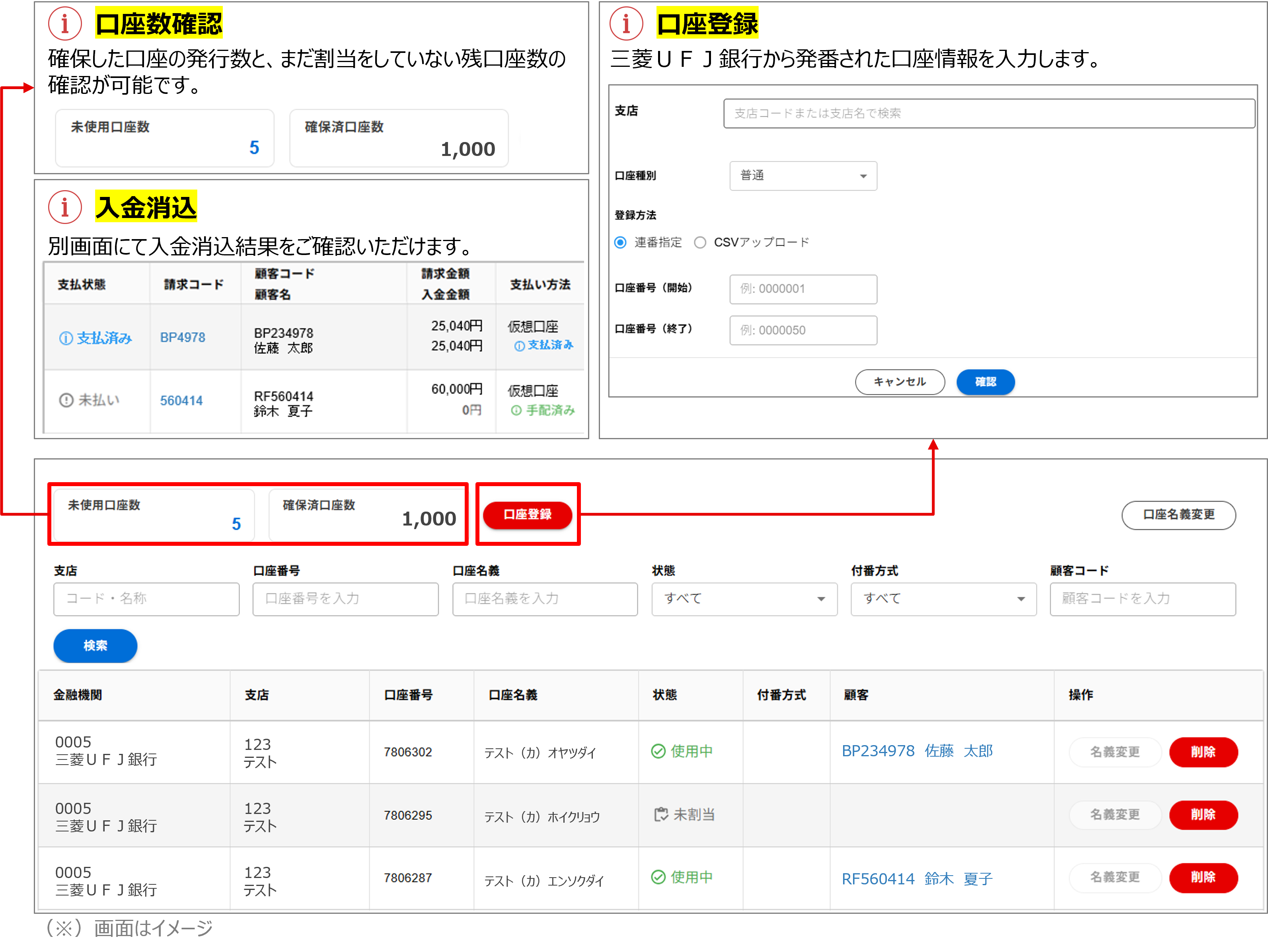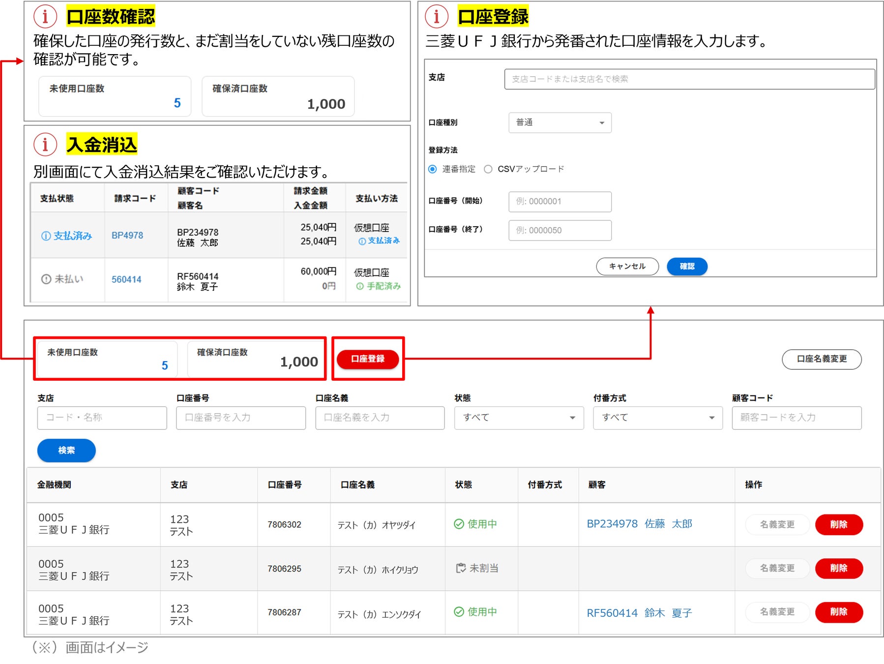 取引先ごとに振込入金専用口座番号を割り当て、マッチングしていただくことで、振込人を正確に特定します。