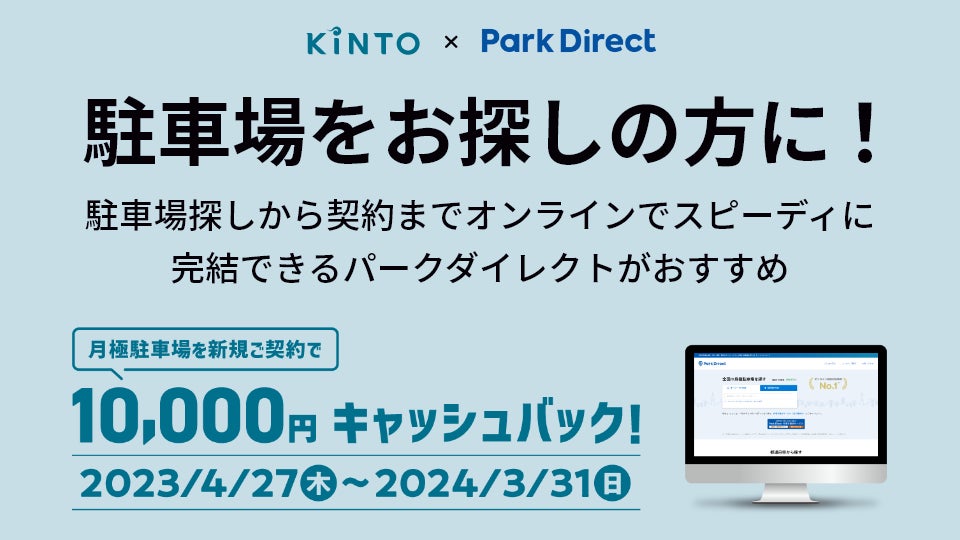 今回は両社での取り組みとして、4月27日より「Park Direct」と「KINTO」(※1)の双方の契約者を対象としたキャッシュバックキャンペーンを実施いたします。