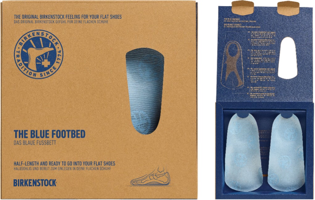 解剖学に基づいたアーチ構造に、水色のライニングが特徴のインソール「ブルーフットベッド」。砂浜の上を歩いているような“自然な歩行”をもたらすというブランドの理念が体現されています。すでに完成された形である既存の「ブルーフットベッド」は、機能の説明が加わった新しいサステナブルなパッケージで発売されます。この「ブルーフットベッド」には、新たにレザーのライニングを用いてクラス感を高めた「ブルーフットベッド レザー」が追加されます。
