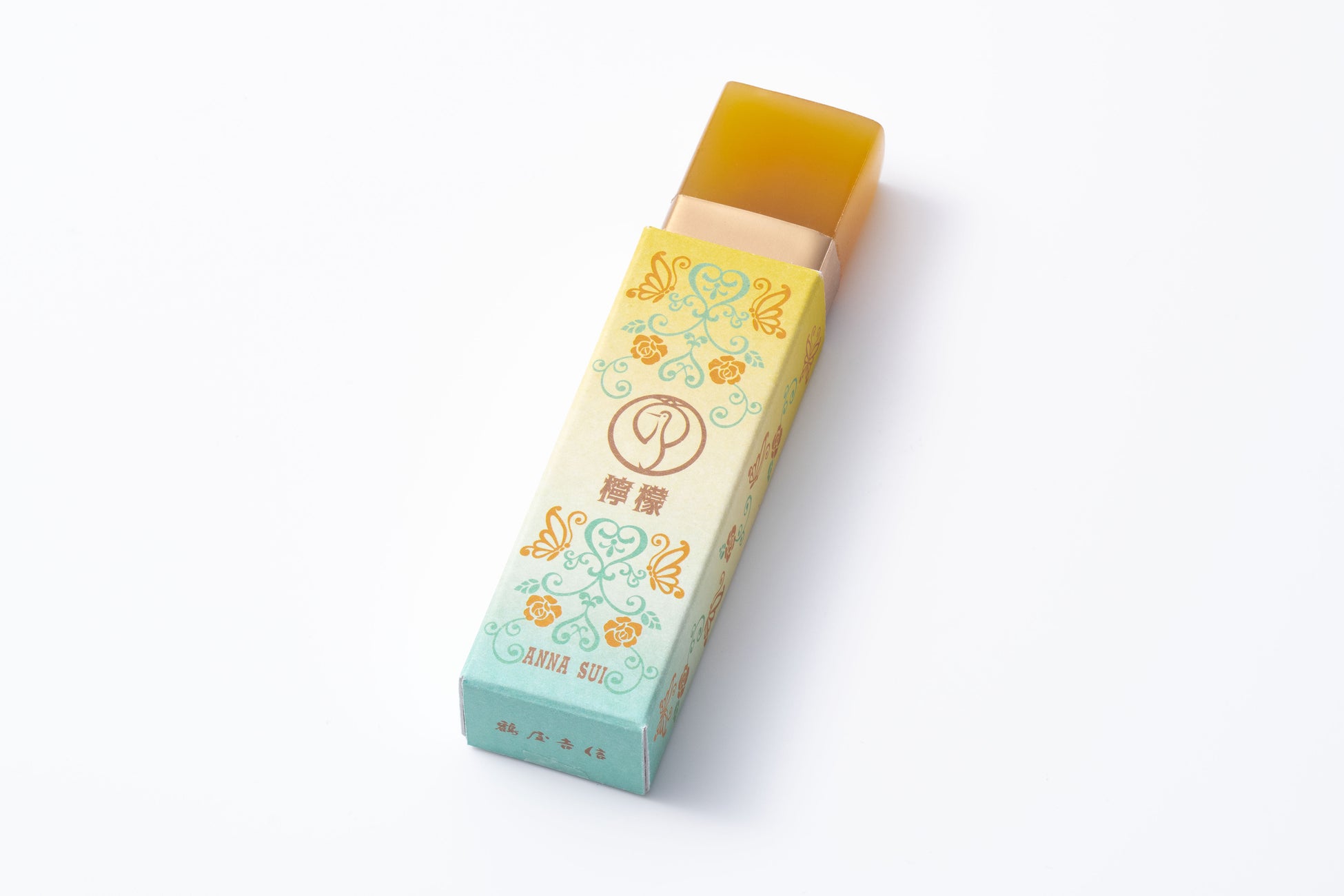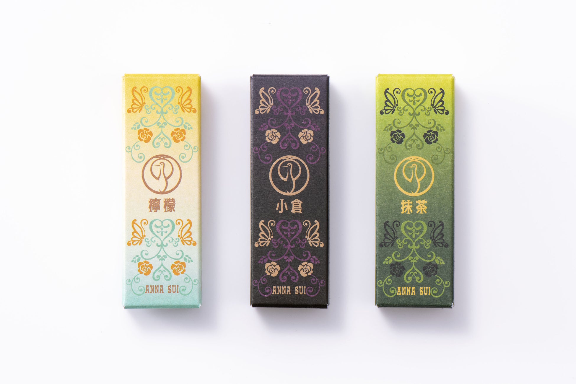 この缶ケースの中に「鶴屋吉信ようかん」3種各1本ずつをお詰合せ。ANNA SUI のブランドアイコンである「蝶」と、鶴屋吉信のロゴマークである「鶴丸」を組み合わせたオリジナルパッケージはそれぞれ、小倉・抹茶・檸檬の3フレーバーをわかりやすく表現したカラーリングです。
