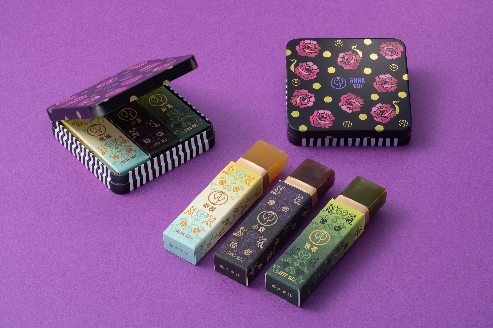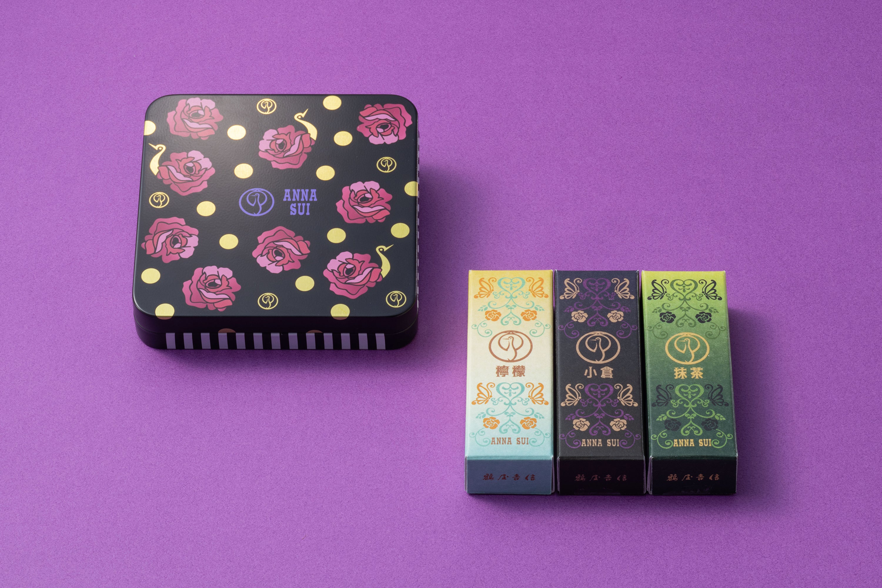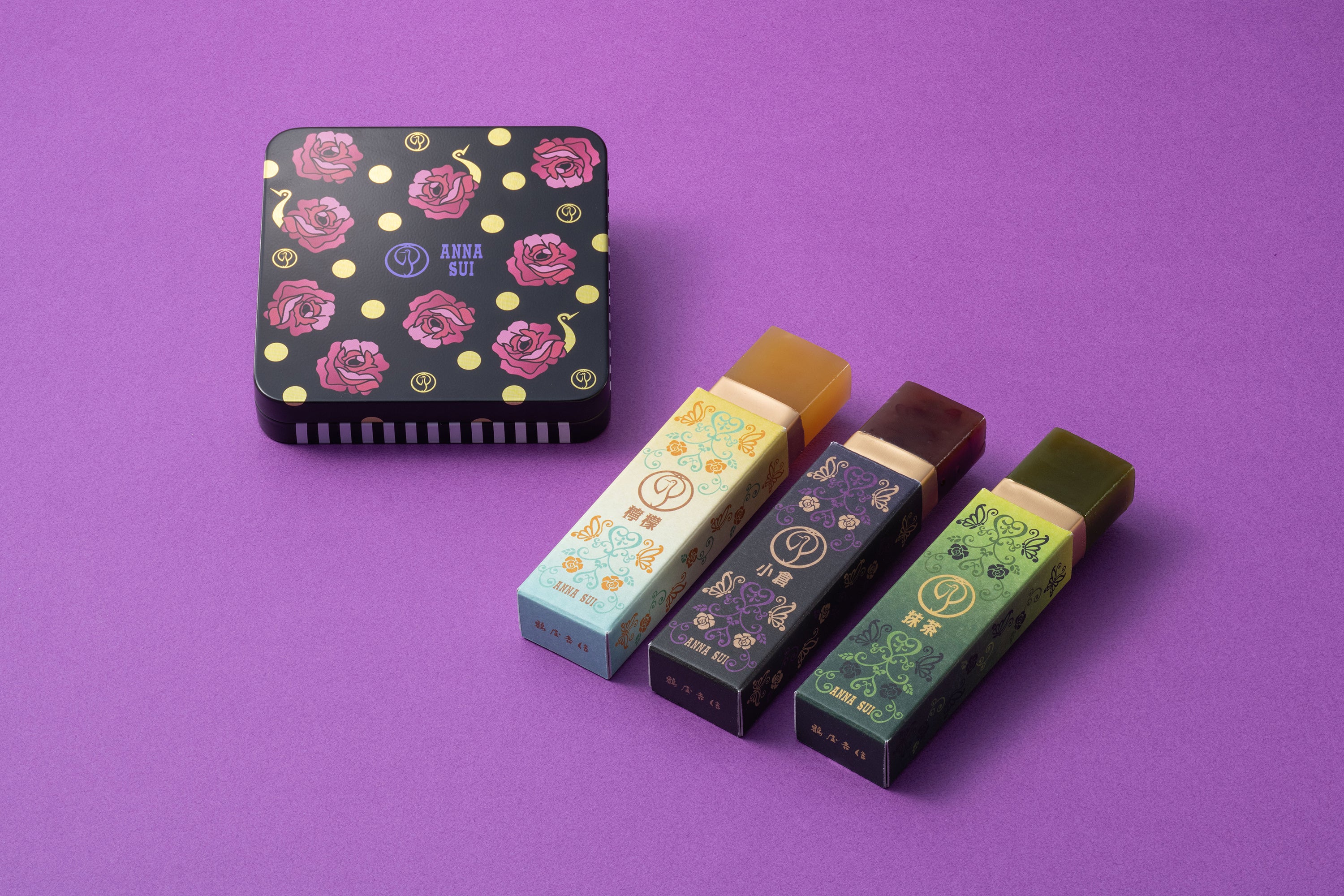 鶴屋吉信の人気商品「鶴屋吉信ようかん」は、伝統の美味しさを手のひらサイズで楽しめる、ミニサイズの羊羹シリーズです(通年販売5種)。今回は定番の「小倉」「抹茶」に、果実感爽やかな「檸檬(れもん)」をくわえた3種のフレーバーをANNA SUIデザインのオリジナルパッケージで包み、限定デザインの缶ケースに収めて数量限定で販売いたします。