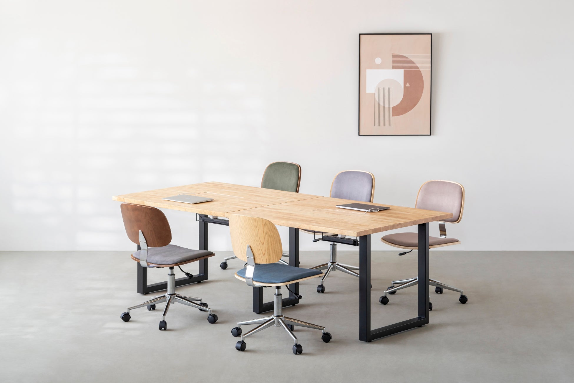 スエード調の生地の優しい手触りとプライウッドの自然な曲線美、脚部の上品な輝きが見る角度によって異なる表情を見せます。脚部はコンパクトなサイズに改良し、複数台の設置時にも収納しやすくなりました。さらに使う場所に合わせてキャスターを2種類からカスタマイズ可能に。フローリング床向けのウレタン製と、カーペット向けのナイロン製をお選びいただけます。背面・座面ともにクッション性も向上させ、昇降機能と合わせて快適で心地の良いデスクワークを叶えます。