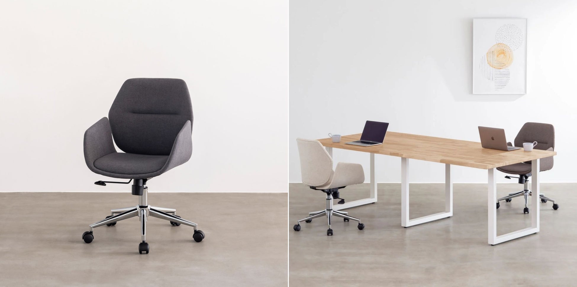 ふっくらとした丸みのあるフォルムと、ベーシックなカラーのファブリックが、空間に穏やかな雰囲気を添える、モダンデザインのデスクチェア。杢の入ったファブリックがほどよくカジュアルな印象をプラスし、無機質になりがちなデスク周りに和やかさを添えます。