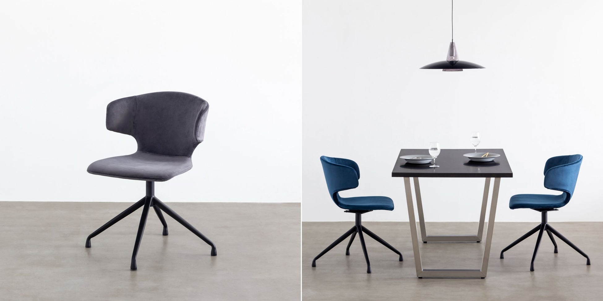 背もたれから座面までの流れるようなフォルムが美しい、ベロア調のラウンドチェア。後座部分をくびれたシェイプにすることにより、強弱のアクセントをつけ、モダン+軽やかさを表現しました。1脚置くだけで空間を華やかにします。