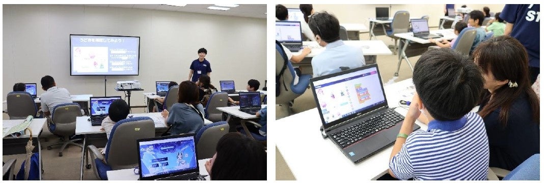 当日の授業は4枠の時間帯で実施され、講師として現役エンジニアが授業を行い、各回に20名ほどの小学生のお子さまがプログラミング体験を行いました。講師は前方のモニターに映して授業を実施。参加者には1人1台プログラミング用のパソコンが貸し出され、モニターを見ながら真剣に講師の話を聞いたり、積極的に質問したりして授業に取り組みました。