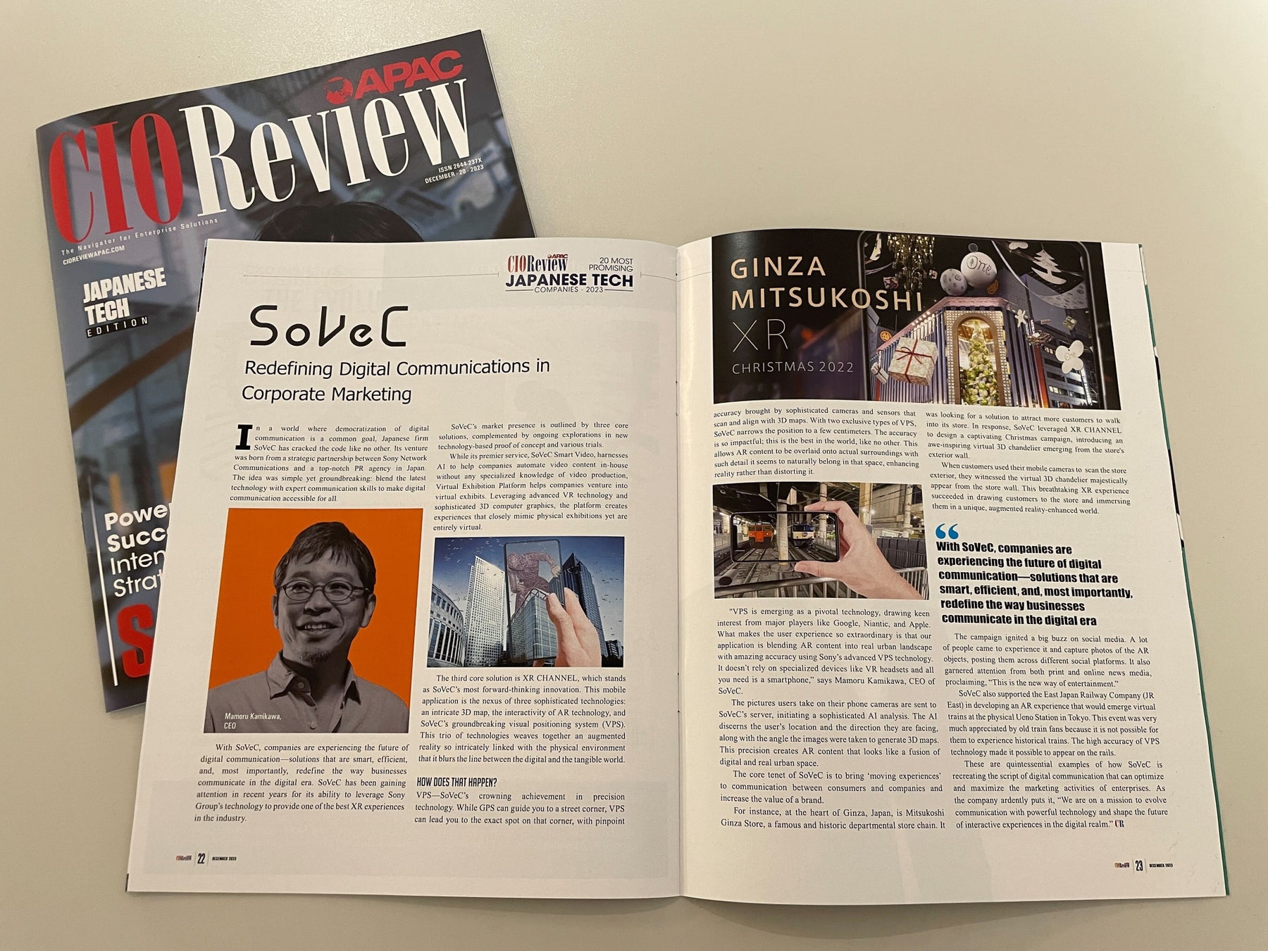 SoVeC(ソベック)株式会社は、アジア太平洋地域で発行されている権威あるIT専門誌「CIOReview APAC」にて、最も有望な日本のテックカンパニーTOP20としてAwardを受賞し、当社が提供するローケーションARアプリ「XR CHANNEL」(※1)をはじめ、SoVeCのデジタルソリューションサービスに関する特集記事が掲載されました。