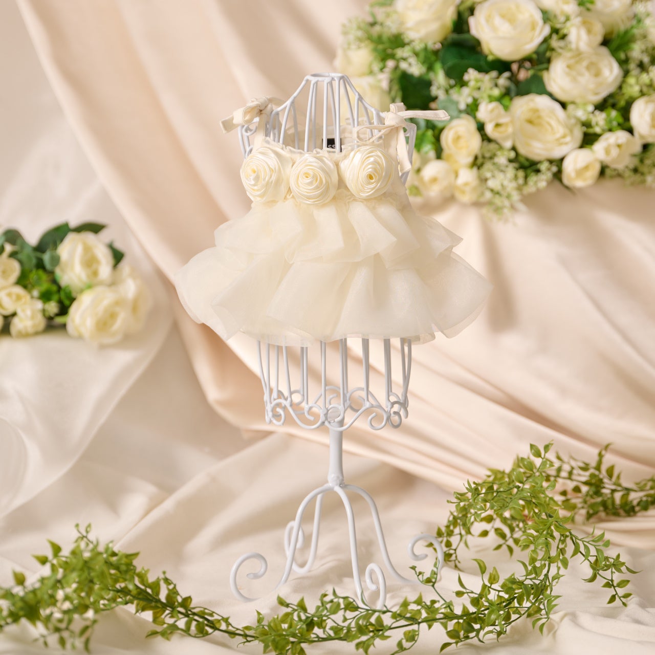 オールホワイトのサテン素材を使用し、薔薇モチーフが印象的です。サイドから見てもギャザーの美しさが際立つオーガンジー素材を贅沢に使用し、短めの着丈で可愛らしさを演出しています。単体での着用はもちろん、重ね着のアレンジも楽しめるアイテムです。