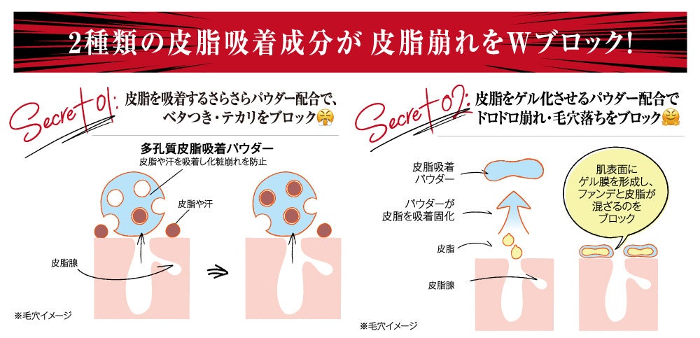 2種類の皮脂吸着成分が皮脂崩れをWブロックし、テカリ・ベタつき・毛穴落ち等を防ぐ為、皮脂崩れをしやすい方におすすめです。