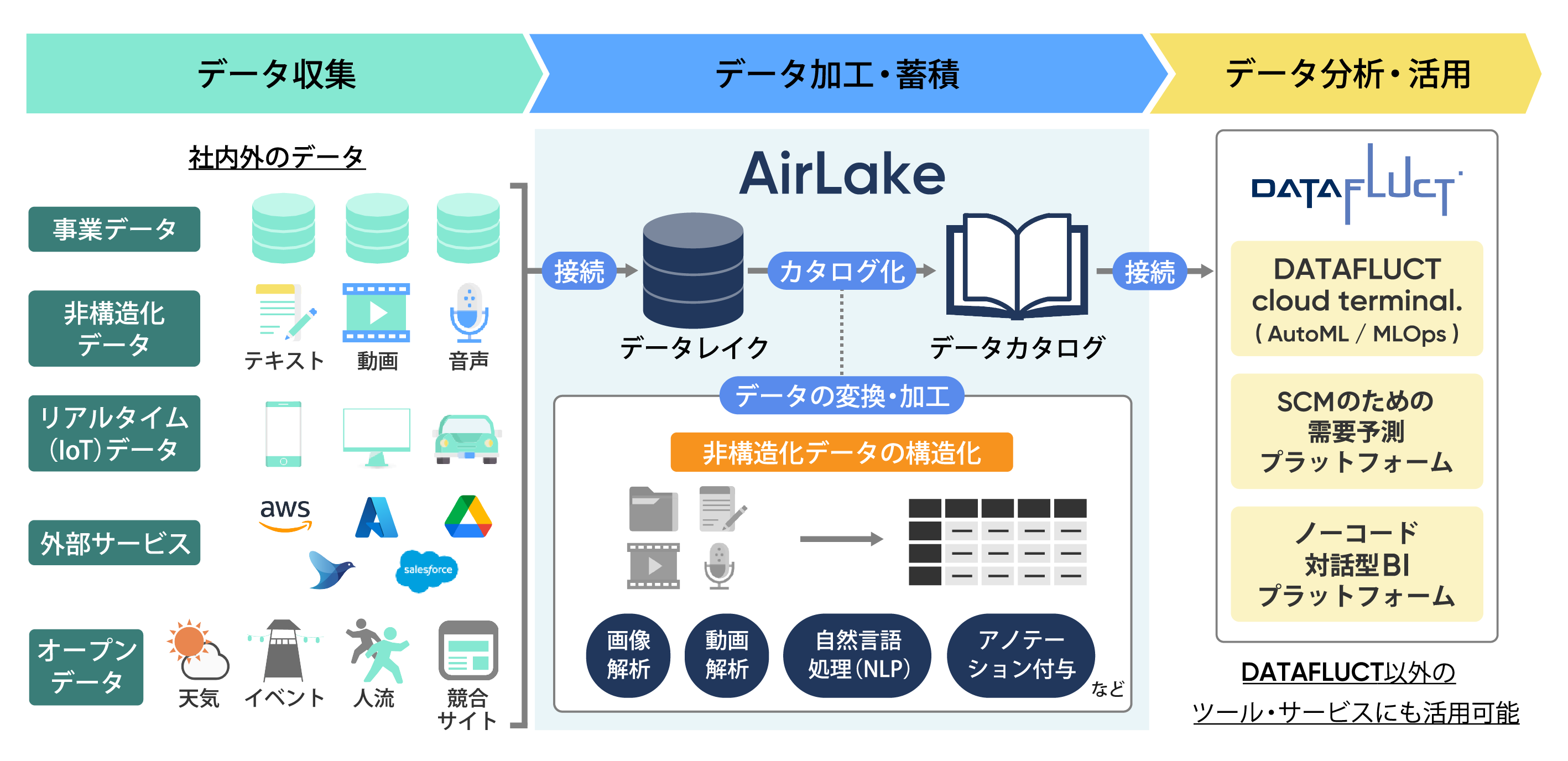 新規サービスとして、社内に散在するデータや外部のオープンデータの集約のほか、非構造化データの構造化などの前処理をAI技術で実行しカタログ化するデータレイク/データウェアハウス『AirLake(エアーレイク)』(特許出願中)の提供を12月中旬より開始します[※3]。また、ノーコードのエンドツーエンド機械学習プラットフォーム(マルチクラウドAutoML)『DATAFLUCT cloud terminal.』を11月下旬にリニューアルします[※4]。