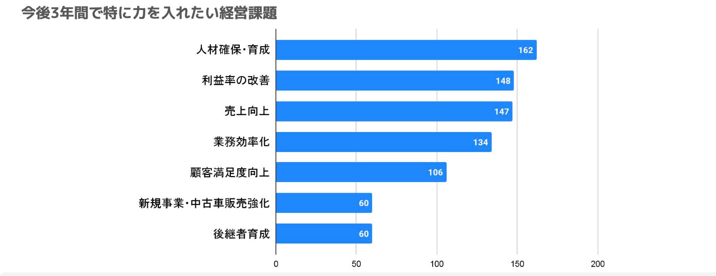 今後3年間で注力したい経営課題として、最も多くの票を集めたの は「人材確保・育成」(162件)でした。 次いで「利益率の改善」(148件)、「売上向上」(147件)が続き、収益基盤の強化が高い関心事となっています