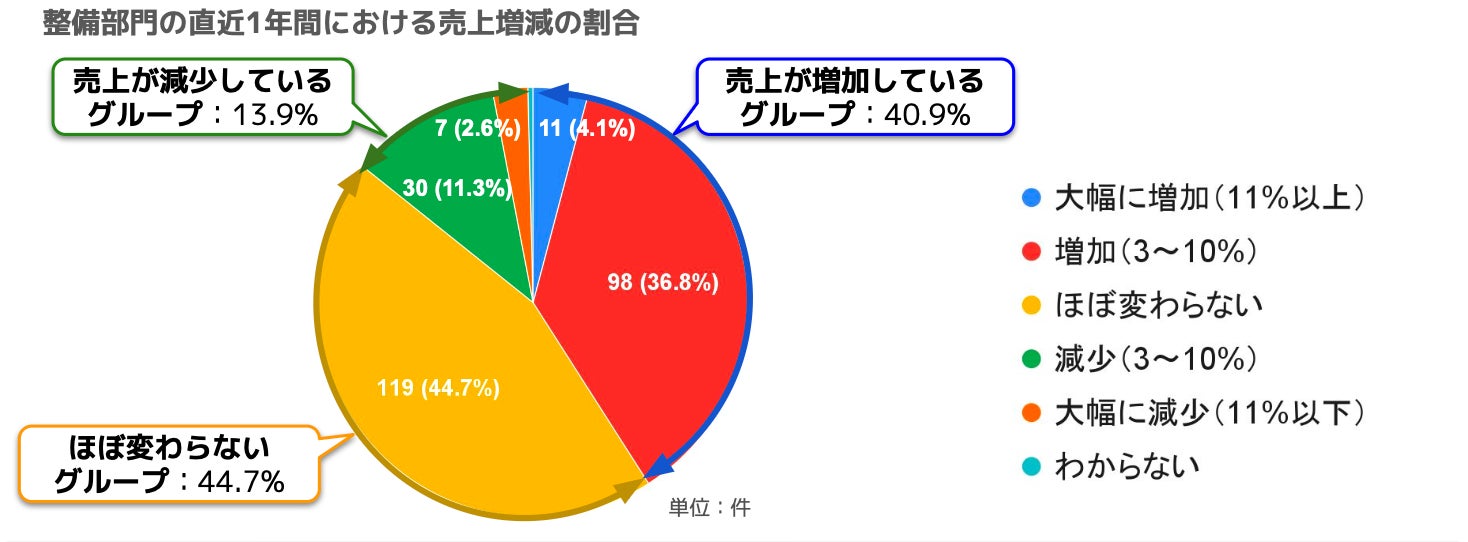 直近1年間の整備部門売上について、「増加している」と回答した工場は全体の40.9%に達し、「減少している」(13.9%)を大きく上回りました。インフレ下での単価見直しなどが奏功し、前年調査と比較しても売上拡大傾向が強まっています。