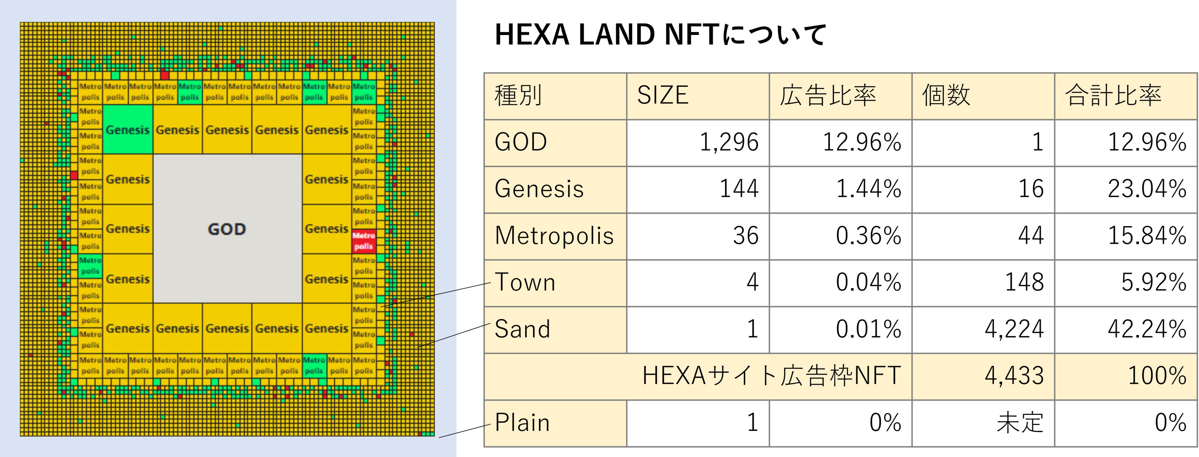 HEXA LAND NFTはこれまで、HEXAサイト上に広告を掲載できる広告枠NFTとしてGod、Genesis、Metropolis、Town、SandのLANDを販売してきました。HEXAメタバース・ゲートウェイプロジェクトの発表に伴い、HEXAサイト上の広告枠を持たないSandの外側のPlain LAND NFTの発売も今後予定しています。Plain LANDはHEXAメタバース空間の人口増加に伴い、未開拓のPlain LANDが徐々に開拓されていく形ととなります。一方、広告枠NFTとしての機能も搭載したGod、Genesis、Metropolis、Town、SandについてはHEXAメタバースの中心部の一等地に位置し、今後追加発行されることは一切ありません(サイト広告枠については5月頃の実装を予定しております)。なお、2022年5月頃までにはαリリースとして、自分の家にHEXAで発行されたNFTを飾って人を招き入れることができるようになる予定です。その後、順次HEXA LANDへの家の設置や建物の建設、HEXA LAND開拓の公共事業、HEXAで発行されていないNFTの対応などが予定されています。