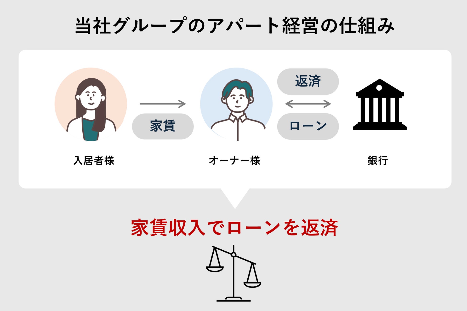 当社グループがご提供するアパート経営は、家賃収入でローンを返済しながら、「資産づくり」を行う仕組みです。この資産づくりを成功させるため、当社グループでは「自社開発一貫体制」にこだわり、用地の選定から企画・設計・施工、引渡後のリーシング・管理までご提供しております。