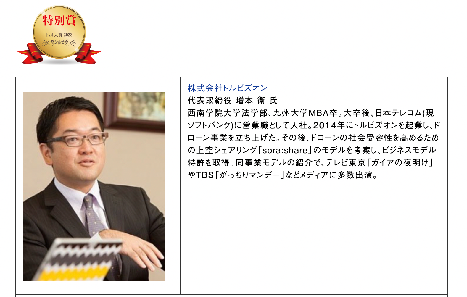 トルビズオンの代表取締役 増本衞は、2022年9月21日、フクオカベンチャーマーケットに登壇し、上空シェアリングサービス [sora:share(ソラシェア)]についてビジネスプランの説明を行いました。当月のマンスリーアワードを受賞、また2023年の特別賞に選出されました。