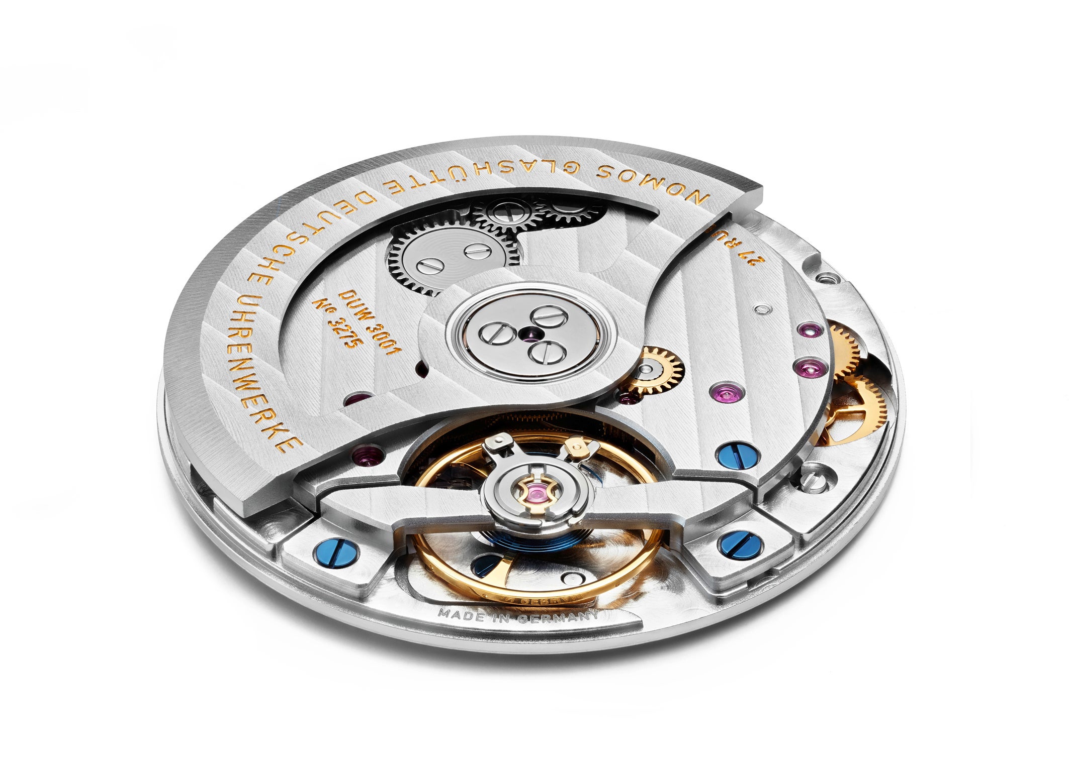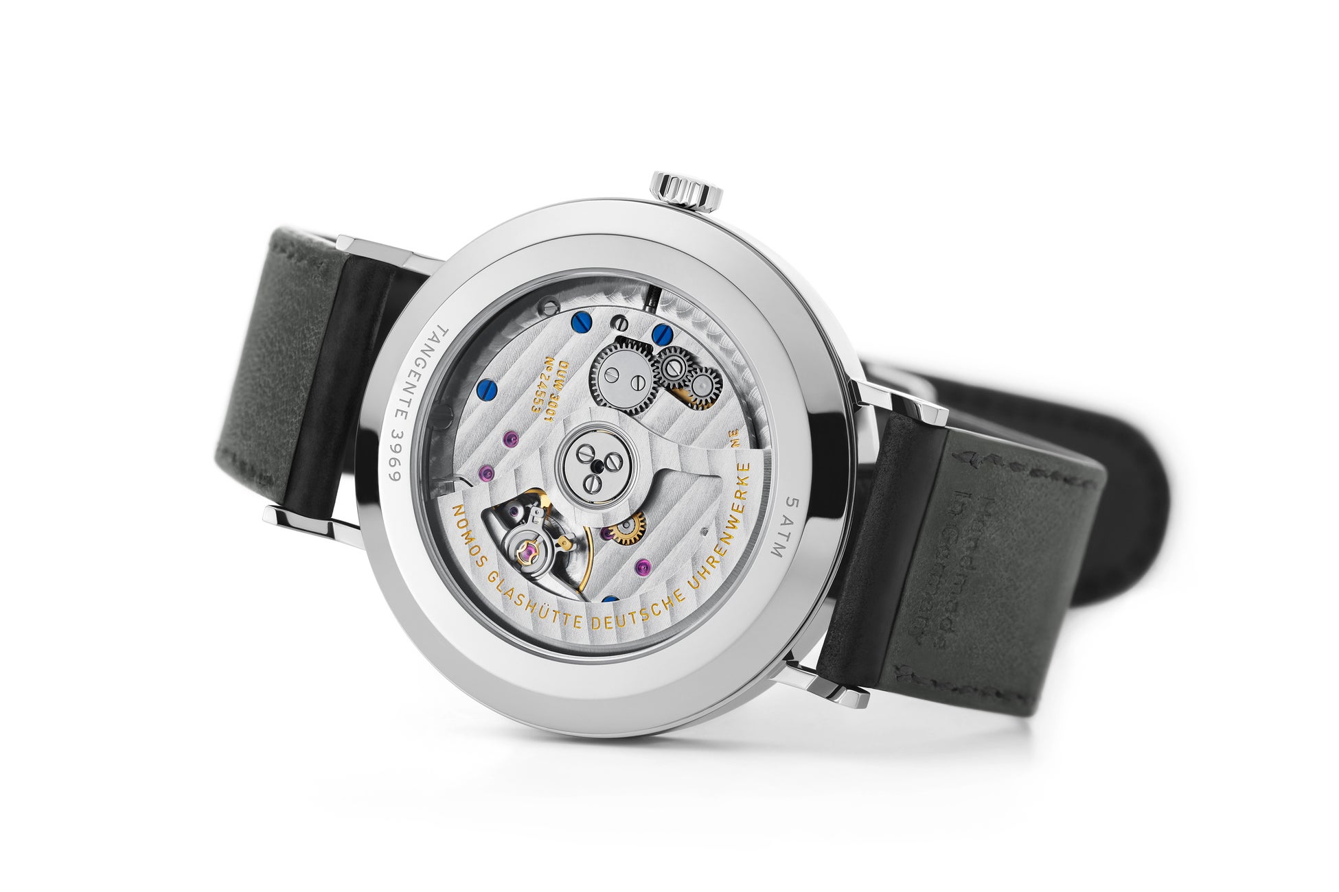 文字盤上では、新世代の自動巻きであることを意味する「neomatik(ネオマティック)」の繊細なゴールドの文字がノモスのブランドロゴの下に配されており、プラチナグレーの文字盤に彩りを添えると同時に、高精度であるだけでなく超薄型の自社開発自動巻キャリバーDUW3001が搭載されていることを表し、開発陣や技術者たちの功績を称えます。サファイヤクリスタルをはめ込んだ裏蓋から両方向巻きの巻き上げローターと美しく装飾されたムーブメントの動きを見ることが出来ます。
